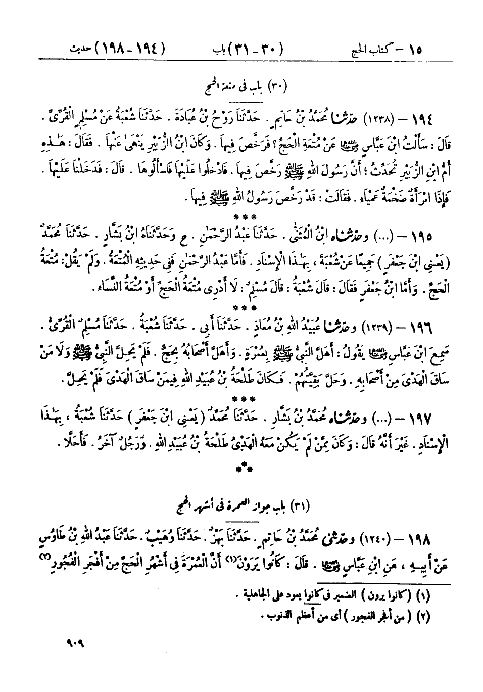 194 - (1238) حَدَّثَنَا مُحَمَّدُ بْنُ حَاتِمٍ، حَدَّثَنَا رَوْحُ بْنُ عُبَادَةَ، حَدَّثَنَا شُعْبَةُ، عَنْ مُسْلِمٍ الْقُرِّيِّ، قَالَ: سَأَلْتُ ابْنَ عَبَّاسٍ رَضِيَ اللهُ عَنْهُمَا، عَنْ مُتْعَةِ الْحَجِّ؟ فَرَخَّصَ فِيهَا، وَكَانَ ابْنُ الزُّبَيْرِ يَنْهَى عَنْهَا، فَقَالَ: هَذِهِ أُمُّ ابْنِ الزُّبَيْرِ تُحَدِّثُ: " أَنَّ رَسُولَ اللهِ صَلَّى اللهُ عَلَيْهِ وَسَلَّمَ §رَخَّصَ فِيهَا، فَادْخُلُوا عَلَيْهَا فَاسْأَلُوهَا، قَالَ: فَدَخَلْنَا عَلَيْهَا، فَإِذَا امْرَأَةٌ ضَخْمَةٌ عَمْيَاءُ، فَقَالَتْ: قَدْ رَخَّصَ رَسُولُ اللهِ صَلَّى اللهُ عَلَيْهِ وَسَلَّمَ فِيهَا "
