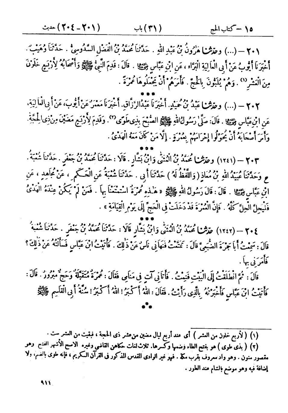 201 - (1240) وحَدَّثَنَا هَارُونُ بْنُ عَبْدِ اللهِ، حَدَّثَنَا مُحَمَّدُ بْنُ الْفَضْلِ السَّدُوسِيُّ، حَدَّثَنَا وُهَيْبٌ، أَخْبَرَنَا أَيُّوبُ، عَنْ أَبِي الْعَالِيَةِ الْبَرَّاءِ، عَنِ ابْنِ عَبَّاسٍ رَضِيَ اللهُ عَنْهُمَا، قَالَ: «قَدِمَ النَّبِيُّ صَلَّى اللهُ عَلَيْهِ وَسَلَّمَ وَأَصْحَابُهُ لِأَرْبَعٍ خَلَوْنَ مِنَ الْعَشْرِ، وَهُمْ يُلَبُّونَ بِالْحَجِّ، §فَأَمَرَهُمْ أَنْ يَجْعَلُوهَا عُمْرَةً»