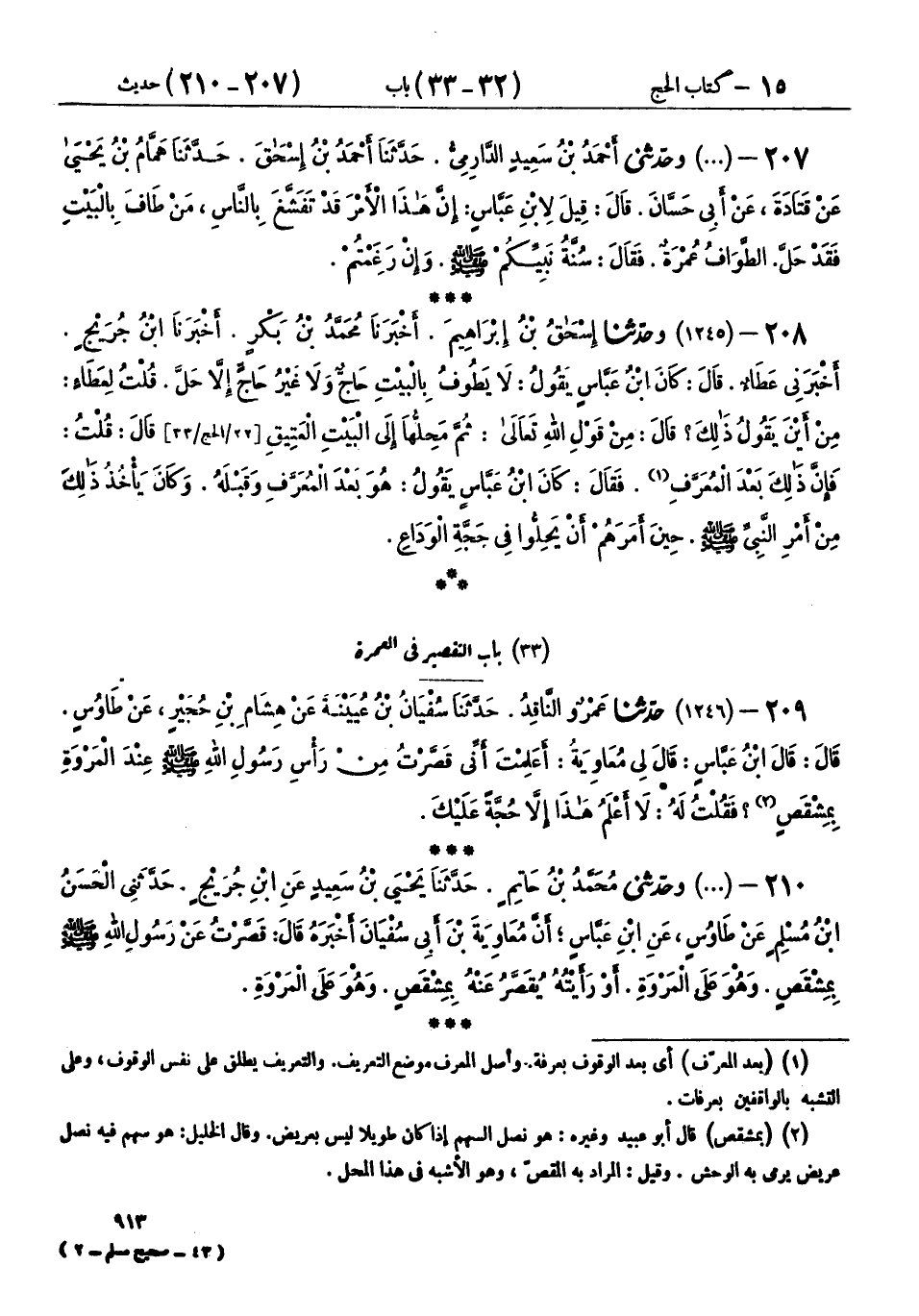 209 - (1246) حَدَّثَنَا عَمْرٌو النَّاقِدُ، حَدَّثَنَا سُفْيَانُ بْنُ عُيَيْنَةَ، عَنْ هِشَامِ بْنِ حُجَيْرٍ، عَنْ طَاوُسٍ، قَالَ: قَالَ ابْنُ عَبَّاسٍ قَالَ لِي مُعَاوِيَةُ: «§أَعَلِمْتَ أَنِّي قَصَّرْتُ مِنْ رَأْسِ رَسُولِ اللهِ صَلَّى اللهُ عَلَيْهِ وَسَلَّمَ عِنْدَ الْمَرْوَةِ بِمِشْقَصٍ؟» فَقُلْتُ لَهُ: لَا أَعْلَمُ هَذَا إِلَّا حُجَّةً عَلَيْكَ