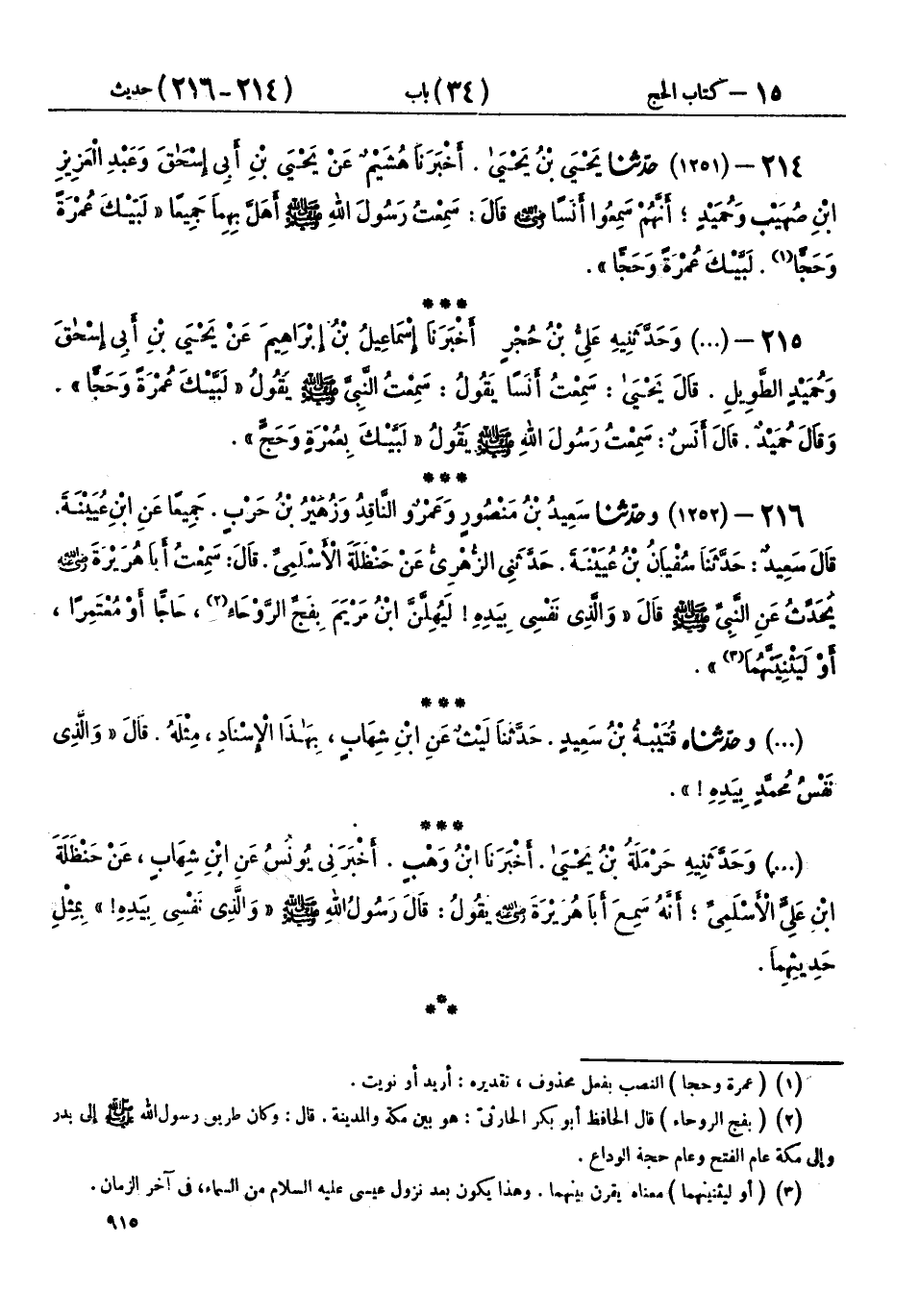 216 - (1252) وحَدَّثَنَا سَعِيدُ بْنُ مَنْصُورٍ، وَعَمْرٌو النَّاقِدُ، وَزُهَيْرُ بْنُ حَرْبٍ، جَمِيعًا عَنِ ابْنِ عُيَيْنَةَ، قَالَ سَعِيدٌ: حَدَّثَنَا سُفْيَانُ بْنُ عُيَيْنَةَ، حَدَّثَنِي الزُّهْرِيُّ، عَنْ حَنْظَلَةَ الْأَسْلَمِيِّ، قَالَ: سَمِعْتُ أَبَا هُرَيْرَةَ رَضِيَ اللهُ عَنْهُ، يُحَدِّثُ عَنِ النَّبِيِّ صَلَّى اللهُ عَلَيْهِ وَسَلَّمَ قَالَ: «وَالَّذِي نَفْسِي بِيَدِهِ، §لَيُهِلَّنَّ ابْنُ مَرْيَمَ بِفَجِّ الرَّوْحَاءِ، حَاجًّا أَوْ مُعْتَمِرًا، أَوْ لَيَثْنِيَنَّهُمَا»