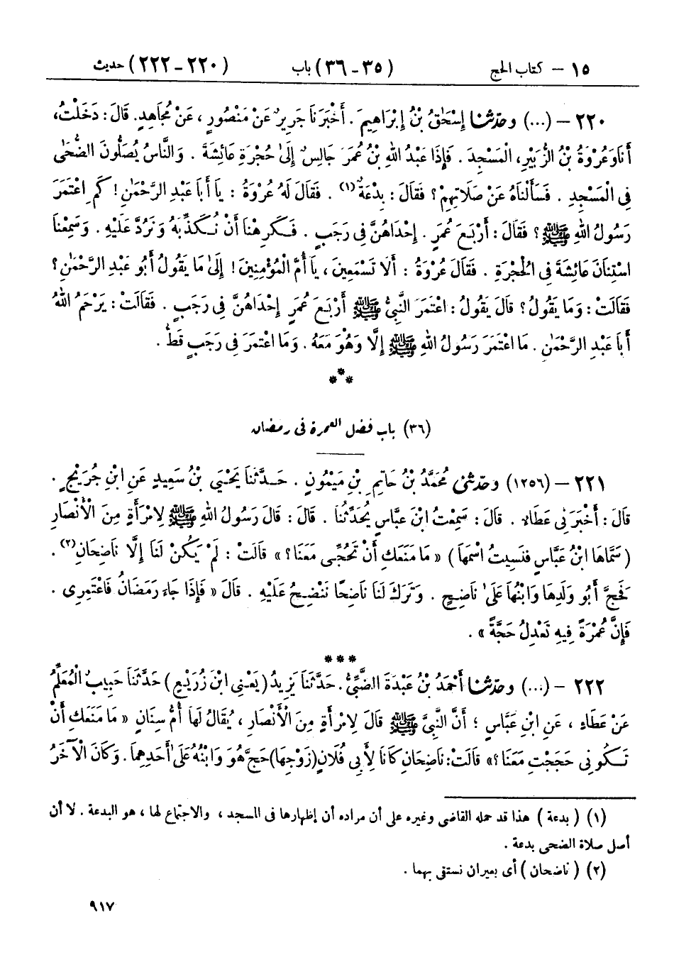 220 - (1255) وحَدَّثَنَا إِسْحَاقُ بْنُ إِبْرَاهِيمَ، أَخْبَرَنَا جَرِيرٌ، عَنْ مَنْصُورٍ، عَنْ مُجَاهِدٍ، قَالَ: دَخَلْتُ أَنَا وَعُرْوَةُ بْنُ الزُّبَيْرِ الْمَسْجِدَ، فَإِذَا عَبْدُ اللهِ بْنُ عُمَرَ جَالِسٌ إِلَى حُجْرَةِ عَائِشَةَ، وَالنَّاسُ يُصَلُّونَ الضُّحَى فِي الْمَسْجِدِ، فَسَأَلْنَاهُ عَنْ صَلَاتِهِمْ؟ فَقَالَ: بِدْعَةٌ، فَقَالَ لَهُ عُرْوَةُ: يَا أَبَا عَبْدِ الرَّحْمَنِ، كَمِ اعْتَمَرَ رَسُولُ اللهِ صَلَّى اللهُ عَلَيْهِ وَسَلَّمَ؟، فَقَالَ: أَرْبَعَ عُمَرٍ، إِحْدَاهُنَّ فِي رَجَبٍ، فَكَرِهْنَا أَنْ نُكَذِّبَهُ وَنَرُدَّ عَلَيْهِ، وَسَمِعْنَا اسْتِنَانَ عَائِشَةَ فِي الْحُجْرَةِ، فَقَالَ عُرْوَةُ: أَلَا تَسْمَعِينَ يَا أُمَّ الْمُؤْمِنِينَ إِلَى مَا يَقُولُ أَبُو عَبْدِ الرَّحْمَنِ، فَقَالَتْ: وَمَا يَقُولُ؟ قَالَ: يَقُولُ: اعْتَمَرَ النَّبِيُّ صَلَّى اللهُ عَلَيْهِ وَسَلَّمَ أَرْبَعَ عُمَرٍ إِحْدَاهُنَّ فِي رَجَبٍ فَقَالَتْ: يَرْحَمُ اللهُ أَبَا عَبْدِ الرَّحْمَنِ «§مَا اعْتَمَرَ رَسُولُ اللهِ صَلَّى اللهُ عَلَيْهِ وَسَلَّمَ، إِلَّا وَهُوَ مَعَهُ، وَمَا اعْتَمَرَ فِي رَجَبٍ قَطُّ»