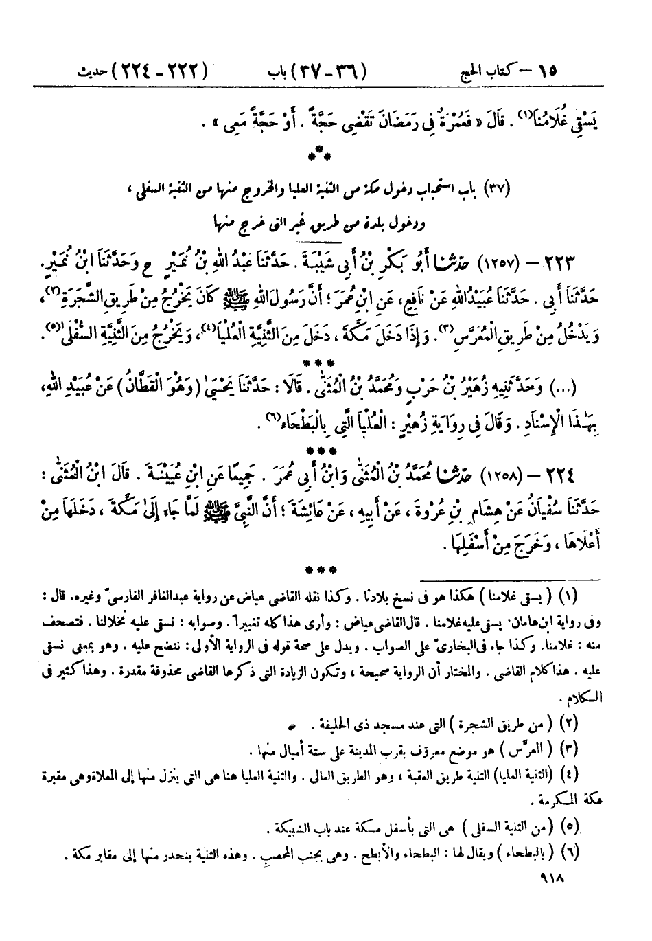 S [ ش (من طريق الشجرة) التي عند مسجد ذي الحليفة (المعرس) هو موضع معروف بقرب المدينة على ستة أميال منها (الثنية العليا) الثنية طريق العقبة وهو الطريق العالي والثنية العليا هنا هي التي ينزل منها إلى المعلاة وهي مقبرة مكة المكرمة (من الثنية السفلى) هي التي بأسفل مكة عند باب الشبيكة]