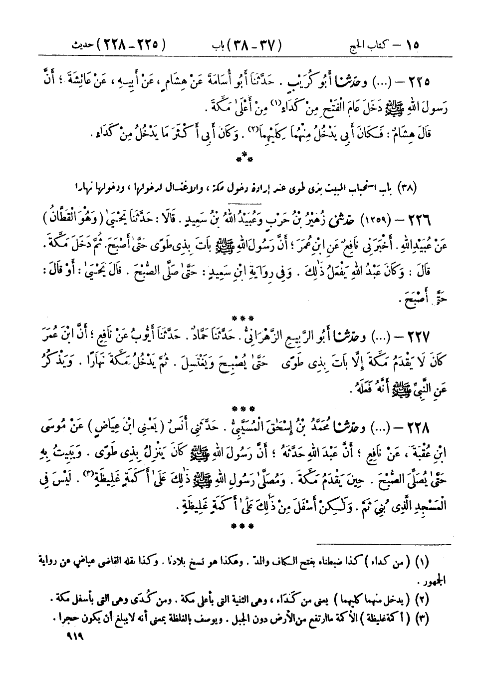 227 - (1259) وحَدَّثَنَا أَبُو الرَّبِيعِ الزَّهْرَانِيُّ، حَدَّثَنَا حَمَّادٌ، حَدَّثَنَا أَيُّوبُ، عَنْ نَافِعٍ، أَنَّ ابْنَ عُمَرَ: «كَانَ §لَا يَقْدَمُ مَكَّةَ إِلَّا بَاتَ بِذِي طَوًى، حَتَّى يُصْبِحَ وَيَغْتَسِلَ ثُمَّ يَدْخُلُ مَكَّةَ نَهَارًا، وَيَذْكُرُ عَنِ النَّبِيِّ صَلَّى اللهُ عَلَيْهِ وَسَلَّمَ أَنَّهُ فَعَلَهُ»