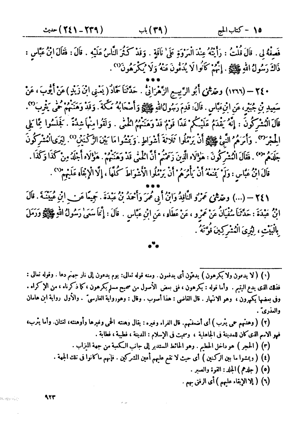 240 - (1266) وحَدَّثَنِي أَبُو الرَّبِيعِ الزَّهْرَانِيُّ، حَدَّثَنَا حَمَّادٌ يَعْنِي ابْنَ زَيْدٍ، عَنْ أَيُّوبَ، عَنْ سَعِيدِ بْنِ جُبَيْرٍ، عَنِ ابْنِ عَبَّاسٍ، قَالَ: " قَدِمَ رَسُولُ اللهِ صَلَّى اللهُ عَلَيْهِ وَسَلَّمَ وَأَصْحَابُهُ مَكَّةَ، وَقَدْ وَهَنَتْهُمْ حُمَّى يَثْرِبَ، قَالَ الْمُشْرِكُونَ: إِنَّهُ يَقْدَمُ عَلَيْكُمْ غَدًا قَوْمٌ قَدْ وَهَنَتْهُمُ الْحُمَّى، وَلَقُوا مِنْهَا شِدَّةً، فَجَلَسُوا مِمَّا يَلِي الْحِجْرَ، وَأَمَرَهُمُ النَّبِيُّ صَلَّى اللهُ عَلَيْهِ وَسَلَّمَ §أَنْ يَرْمُلُوا ثَلَاثَةَ أَشْوَاطٍ، وَيَمْشُوا مَا بَيْنَ الرُّكْنَيْنِ، لِيَرَى الْمُشْرِكُونَ جَلَدَهُمْ، فَقَالَ الْمُشْرِكُونَ: هَؤُلَاءِ الَّذِينَ زَعَمْتُمْ أَنَّ الْحُمَّى قَدْ وَهَنَتْهُمْ، هَؤُلَاءِ أَجْلَدُ مِنْ كَذَا وَكَذَا " قَالَ ابْنُ عَبَّاسٍ: «وَلَمْ يَمْنَعْهُ أَنْ يَأْمُرَهُمْ أَنْ يَرْمُلُوا الْأَشْوَاطَ كُلَّهَا، إِلَّا الْإِبْقَاءُ عَلَيْهِمْ»