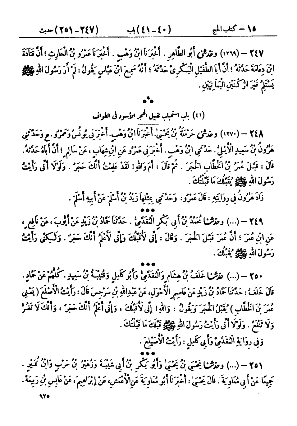 251 - (1270) وحَدَّثَنَا يَحْيَى بْنُ يَحْيَى، وَأَبُو بَكْرِ بْنُ أَبِي شَيْبَةَ، وَزُهَيْرُ بْنُ حَرْبٍ، وَابْنُ نُمَيْرٍ، جَمِيعًا عَنْ أَبِي مُعَاوِيَةَ، قَالَ يَحْيَى: أَخْبَرَنَا أَبُو مُعَاوِيَةَ، عَنِ الْأَعْمَشِ، عَنْ إِبْرَاهِيمَ، عَنْ عَابِسِ بْنِ رَبِيعَةَ، قَالَ: رَأَيْتُ عُمَرَ يُقَبِّلُ الْحَجَرَ، وَيَقُولُ: «§إِنِّي لَأُقَبِّلُكَ وَأَعْلَمُ أَنَّكَ حَجَرٌ، وَلَوْلَا أَنِّي رَأَيْتُ رَسُولَ اللهِ صَلَّى اللهُ عَلَيْهِ وَسَلَّمَ يُقَبِّلُكَ لَمْ أُقَبِّلْكَ»