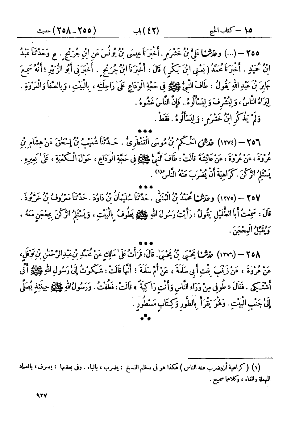 256 - (1274) حَدَّثَنِي الْحَكَمُ بْنُ مُوسَى الْقَنْطَرِيُّ، حَدَّثَنَا شُعَيْبُ بْنُ إِسْحَاقَ، عَنْ هِشَامِ بْنِ عُرْوَةَ، عَنْ عُرْوَةَ، عَنْ عَائِشَةَ، قَالَتْ: «§طَافَ النَّبِيُّ صَلَّى اللهُ عَلَيْهِ وَسَلَّمَ فِي حَجَّةِ الْوَدَاعِ حَوْلَ الْكَعْبَةِ عَلَى بَعِيرِهِ، يَسْتَلِمُ الرُّكْنَ كَرَاهِيَةَ أَنْ يُضْرَبَ عَنْهُ النَّاسُ»