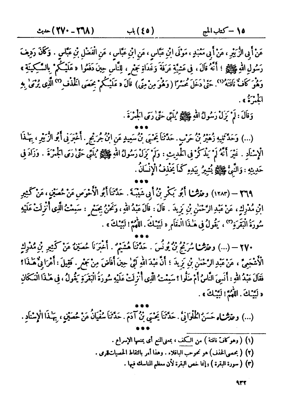 270 - (1283) وحَدَّثَنَا سُرَيْجُ بْنُ يُونُسَ، حَدَّثَنَا هُشَيْمٌ، أَخْبَرَنَا حُصَيْنٌ، عَنْ كَثِيرِ بْنِ مُدْرِكٍ الْأَشْجَعِيِّ، عَنْ عَبْدِ الرَّحْمَنِ بْنِ يَزِيدَ، أَنَّ عَبْدَ اللهِ، لَبَّى حِينَ أَفَاضَ مِنْ جَمْعٍ فَقِيلَ أَعْرَابِيٌّ هَذَا؟ فَقَالَ عَبْدُ اللهِ: أَنَسِيَ النَّاسُ أَمْ ضَلُّوا، سَمِعْتُ الَّذِي أُنْزِلَتْ عَلَيْهِ سُورَةُ الْبَقَرَةِ يَقُولُ: فِي هَذَا الْمَكَانِ «§لَبَّيْكَ، اللهُمَّ، لَبَّيْكَ»