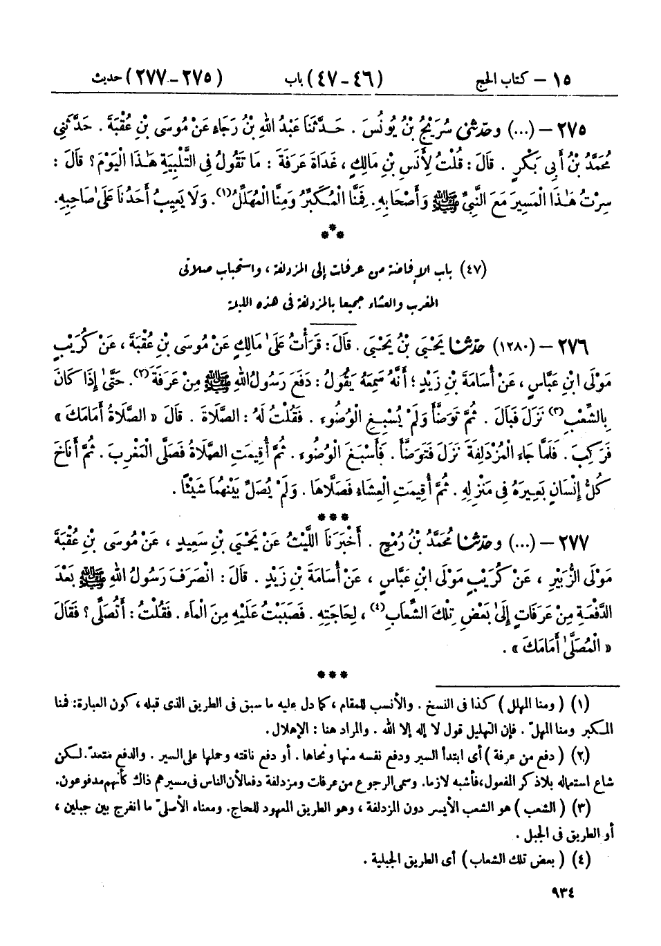 276 - (1280) حَدَّثَنَا يَحْيَى بْنُ يَحْيَى، قَالَ: قَرَأْتُ عَلَى مَالِكٍ، عَنْ مُوسَى بْنِ عُقْبَةَ، عَنْ كُرَيْبٍ، مَوْلَى ابْنِ عَبَّاسٍ، عَنْ أُسَامَةَ بْنِ زَيْدٍ، أَنَّهُ سَمِعَهُ يَقُولُ: " دَفَعَ رَسُولُ اللهِ صَلَّى اللهُ عَلَيْهِ وَسَلَّمَ مِنْ عَرَفَةَ حَتَّى إِذَا كَانَ بِالشِّعْبِ نَزَلَ فَبَالَ ثُمَّ تَوَضَّأَ وَلَمْ يُسْبِغِ الْوُضُوءَ، فَقُلْتُ لَهُ: الصَّلَاةَ، قَالَ: §الصَّلَاةُ أَمَامَكَ فَرَكِبَ، فَلَمَّا جَاءَ الْمُزْدَلِفَةَ نَزَلَ فَتَوَضَّأَ، فَأَسْبَغَ الْوُضُوءَ، ثُمَّ أُقِيمَتِ الصَّلَاةُ فَصَلَّى الْمَغْرِبَ، ثُمَّ أَنَاخَ كُلُّ إِنْسَانٍ بَعِيرَهُ فِي مَنْزِلِهِ، ثُمَّ أُقِيمَتِ الْعِشَاءُ فَصَلَّاهَا، وَلَمْ يُصَلِّ بَيْنَهُمَا شَيْئًا "