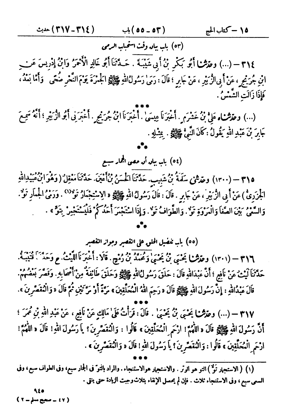 315 - (1300) وحَدَّثَنِي سَلَمَةُ بْنُ شَبِيبٍ، حَدَّثَنَا الْحَسَنُ بْنُ أَعْيَنَ، حَدَّثَنَا مَعْقِلٌ وَهُوَ ابْنُ عُبَيْدِ اللهِ الْجَزَرِيُّ، عَنْ أَبِي الزُّبَيْرِ، عَنْ جَابِرٍ، قَالَ: قَالَ رَسُولُ اللهِ صَلَّى اللهُ عَلَيْهِ وَسَلَّمَ: «§الِاسْتِجْمَارُ تَوٌّ، وَرَمْيُ الْجِمَارِ تَوٌّ، وَالسَّعْيُ بَيْنَ الصَّفَا وَالْمَرْوَةِ تَوٌّ، وَالطَّوَافُ تَوٌّ، وَإِذَا اسْتَجْمَرَ أَحَدُكُمْ، فَلْيَسْتَجْمِرْ بِتَوٍّ»