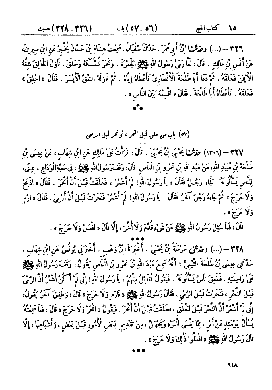 327 - (1306) حَدَّثَنَا يَحْيَى بْنُ يَحْيَى، قَالَ: قَرَأْتُ عَلَى مَالِكٍ، عَنِ ابْنِ شِهَابٍ، عَنْ عِيسَى بْنِ طَلْحَةَ بْنِ عُبَيْدِ اللهِ، عَنْ عَبْدِ اللهِ بْنِ عَمْرِو بْنِ الْعَاصِ، قَالَ: وَقَفَ رَسُولُ اللهِ صَلَّى اللهُ عَلَيْهِ وَسَلَّمَ فِي حَجَّةِ الْوَدَاعِ، بِمِنًى، لِلنَّاسِ يَسْأَلُونَهُ، فَجَاءَ رَجُلٌ فَقَالَ: يَا رَسُولَ اللهِ، لَمْ أَشْعُرْ، فَحَلَقْتُ قَبْلَ أَنْ أَنْحَرَ، فَقَالَ: «§اذْبَحْ وَلَا حَرَجَ» ثُمَّ جَاءَهُ رَجُلٌ آخَرُ، فَقَالَ: يَا رَسُولَ اللهِ، لَمْ أَشْعُرْ فَنَحَرْتُ قَبْلَ أَنْ أَرْمِيَ، فَقَالَ: «ارْمِ وَلَا حَرَجَ» قَالَ: فَمَا سُئِلَ رَسُولُ اللهِ صَلَّى اللهُ عَلَيْهِ وَسَلَّمَ عَنْ شَيْءٍ قُدِّمَ وَلَا أُخِّرَ، إِلَّا قَالَ: «افْعَلْ وَلَا حَرَجَ»