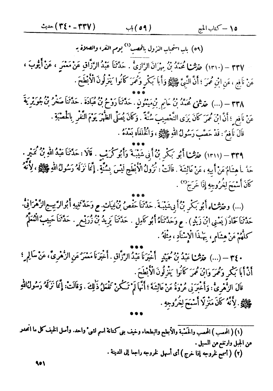 338 - (1310) حَدَّثَنِي مُحَمَّدُ بْنُ حَاتِمِ بْنِ مَيْمُونٍ، حَدَّثَنَا رَوْحُ بْنُ عُبَادَةَ، حَدَّثَنَا صَخْرُ بْنُ جُوَيْرِيَةَ، عَنْ نَافِعٍ، أَنَّ ابْنَ عُمَرَ، كَانَ يَرَى التَّحْصِيبَ سُنَّةً، وَكَانَ يُصَلِّي الظُّهْرَ يَوْمَ النَّفْرِ بِالْحَصْبَةِ، قَالَ نَافِعٌ: «§قَدْ حَصَّبَ رَسُولُ اللهِ صَلَّى اللهُ عَلَيْهِ وَسَلَّمَ وَالْخُلَفَاءُ بَعْدَهُ»