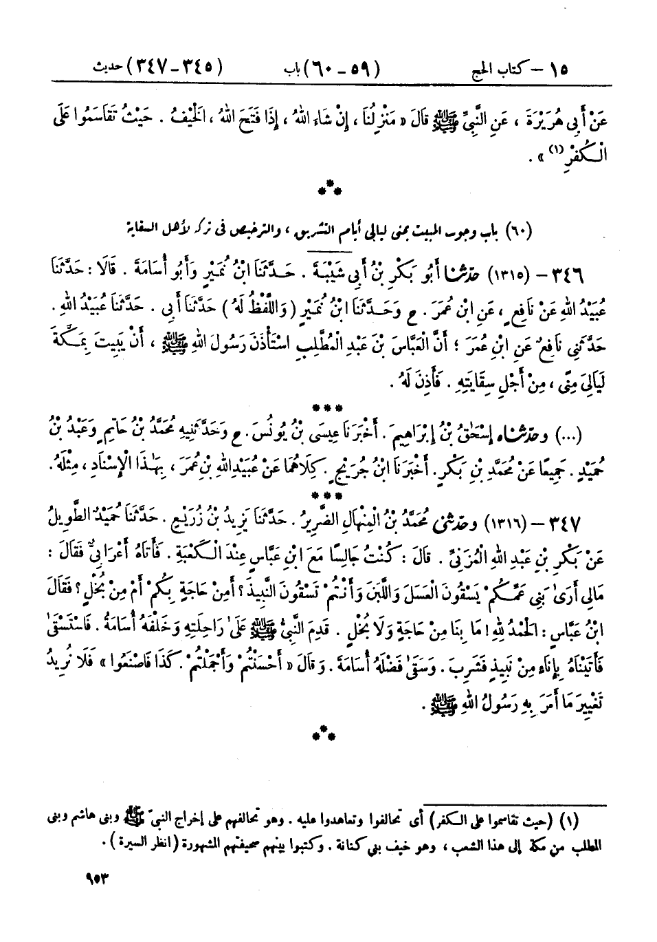 346 - (1315) حَدَّثَنَا أَبُو بَكْرِ بْنُ أَبِي شَيْبَةَ، حَدَّثَنَا ابْنُ نُمَيْرٍ، وَأَبُو أُسَامَةَ، قَالَا: حَدَّثَنَا عُبَيْدُ اللهِ، عَنْ نَافِعٍ، عَنِ ابْنِ عُمَرَ، ح وحَدَّثَنَا ابْنُ نُمَيْرٍ، - وَاللَّفْظُ لَهُ - حَدَّثَنَا أَبِي، حَدَّثَنَا عُبَيْدُ اللهِ، حَدَّثَنِي نَافِعٌ، عَنِ ابْنِ عُمَرَ، «أَنَّ الْعَبَّاسَ بْنَ عَبْدِ الْمُطَّلِبِ، اسْتَأْذَنَ رَسُولَ اللهِ صَلَّى اللهُ عَلَيْهِ وَسَلَّمَ، أَنْ §يَبِيتَ بِمَكَّةَ لَيَالِي مِنًى، مِنْ أَجْلِ سِقَايَتِهِ، فَأَذِنَ لَهُ»