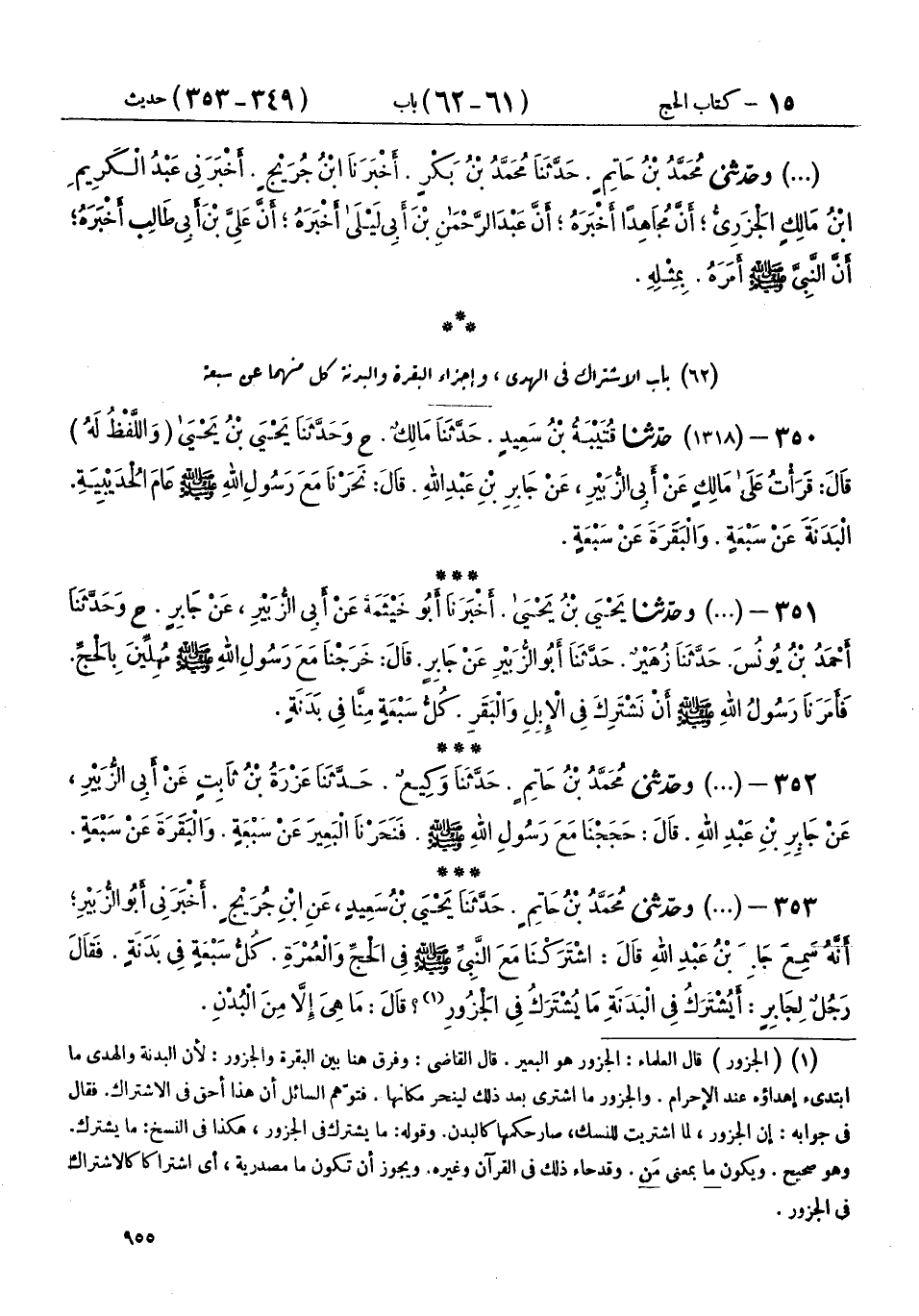 353 - (1318) وحَدَّثَنِي مُحَمَّدُ بْنُ حَاتِمٍ، حَدَّثَنَا يَحْيَى بْنُ سَعِيدٍ، عَنِ ابْنِ جُرَيْجٍ، أَخْبَرَنِي أَبُو الزُّبَيْرِ، أَنَّهُ سَمِعَ جَابِرَ بْنَ عَبْدِ اللهِ، قَالَ: «§اشْتَرَكْنَا مَعَ النَّبِيِّ صَلَّى اللهُ عَلَيْهِ وَسَلَّمَ فِي الْحَجِّ وَالْعُمْرَةِ كُلُّ سَبْعَةٍ فِي بَدَنَةٍ» فَقَالَ رَجُلٌ لِجَابِرٍ: أَيُشْتَرَكُ فِي الْبَدَنَةِ مَا يُشْتَرَكُ فِي الْجَزُورِ؟ قَالَ: " مَا هِيَ إِلَّا مِنَ الْبُدْنِ، وَحَضَرَ جَابِرٌ الْحُدَيْبِيَةَ، قَالَ: نَحَرْنَا يَوْمَئِذٍ سَبْعِينَ بَدَنَةً اشْتَرَكْنَا كُلُّ سَبْعَةٍ فِي بَدَنَةٍ "