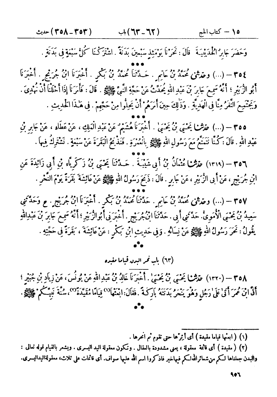 358 - (1320) حَدَّثَنَا يَحْيَى بْنُ يَحْيَى، أَخْبَرَنَا خَالِدُ بْنُ عَبْدِ اللهِ، عَنْ يُونُسَ، عَنْ زِيَادِ بْنِ جُبَيْرٍ، أَنَّ ابْنَ عُمَرَ، أَتَى عَلَى رَجُلٍ وَهُوَ يَنْحَرُ بَدَنَتَهُ بَارِكَةً، فَقَالَ: «§ابْعَثْهَا قِيَامًا مُقَيَّدَةً، سُنَّةَ نَبِيِّكُمْ صَلَّى اللهُ عَلَيْهِ وَسَلَّمَ»