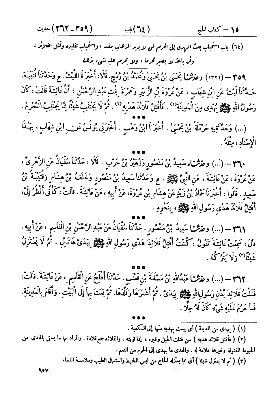 360 - (1321) وحَدَّثَنَاه سَعِيدُ بْنُ مَنْصُورٍ، وَزُهَيْرُ بْنُ حَرْبٍ، قَالَا: حَدَّثَنَا سُفْيَانُ، عَنِ الزُّهْرِيِّ، عَنْ عُرْوَةَ، عَنْ عَائِشَةَ، عَنِ النَّبِيِّ صَلَّى اللهُ عَلَيْهِ وَسَلَّمَ، ح وحَدَّثَنَا سَعِيدُ بْنُ مَنْصُورٍ، وَخَلَفُ بْنُ هِشَامٍ، وَقُتَيْبَةُ بْنُ سَعِيدٍ، قَالُوا: أَخْبَرَنَا حَمَّادُ بْنُ زَيْدٍ، عَنْ هِشَامِ بْنِ عُرْوَةَ، عَنْ أَبِيهِ، عَنْ عَائِشَةَ، قَالَتْ: كَأَنِّي أَنْظُرُ إِلَيَّ أَفْتِلُ قَلَائِدَ هَدْيِ رَسُولِ اللهِ صَلَّى اللهُ عَلَيْهِ وَسَلَّمَ بِنَحْوِهِ