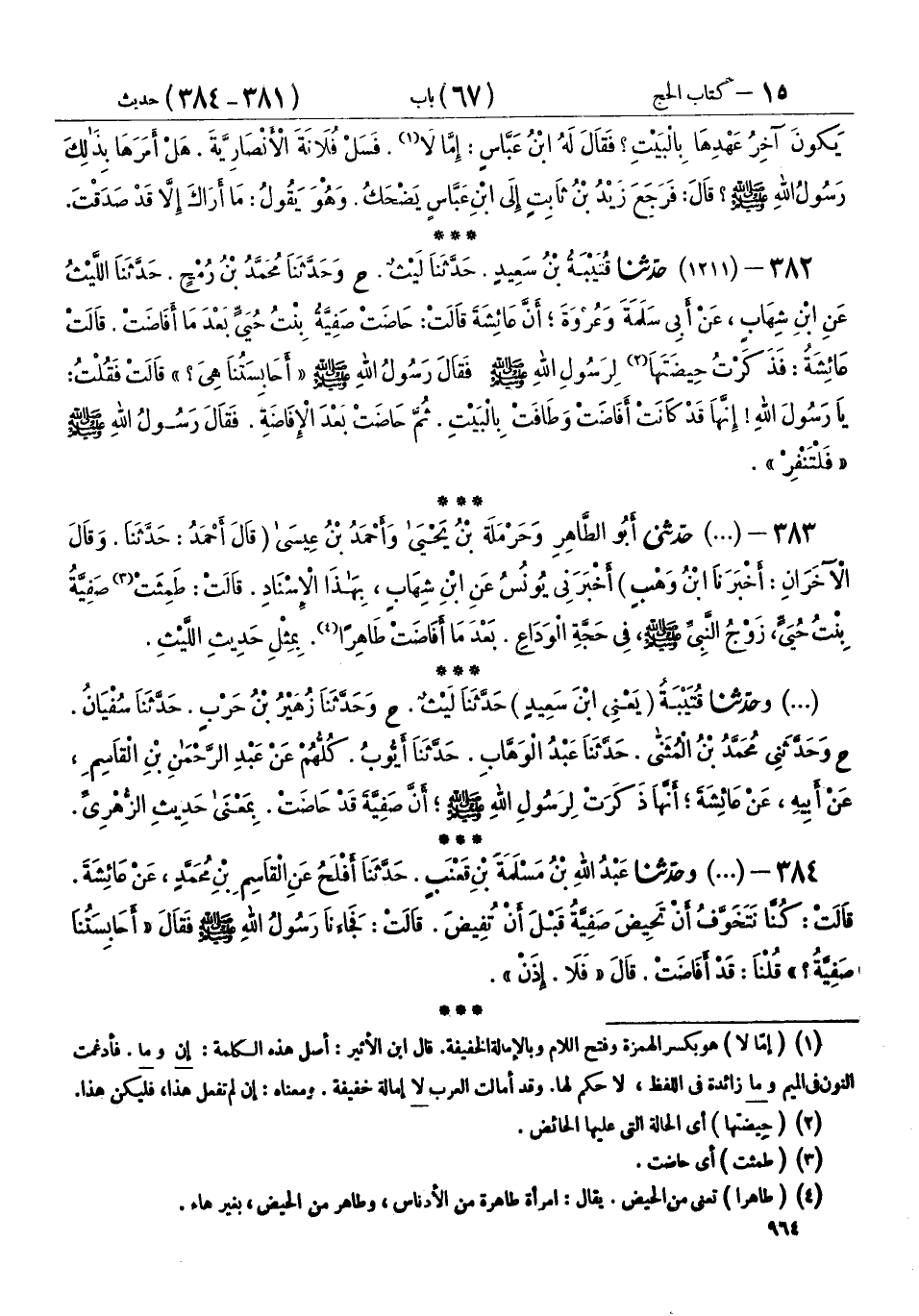 383 - (1211) حَدَّثَنِي أَبُو الطَّاهِرِ، وَحَرْمَلَةُ بْنُ يَحْيَى، وَأَحْمَدُ بْنُ عِيسَى، قَالَ أَحْمَدُ: حَدَّثَنَا، وَقَالَ الْآخَرَانِ: أَخْبَرَنَا ابْنُ وَهْبٍ، أَخْبَرَنِي يُونُسُ، عَنِ ابْنِ شِهَابٍ، بِهَذَا الْإِسْنَادِ. قَالَتْ: طَمِثَتْ صَفِيَّةُ بِنْتُ حُيَيٍّ، زَوْجُ النَّبِيِّ صَلَّى اللهُ عَلَيْهِ وَسَلَّمَ، فِي حَجَّةِ الْوَدَاعِ بَعْدَمَا أَفَاضَتْ طَاهِرًا، بِمِثْلِ حَدِيثِ اللَّيْثِ،