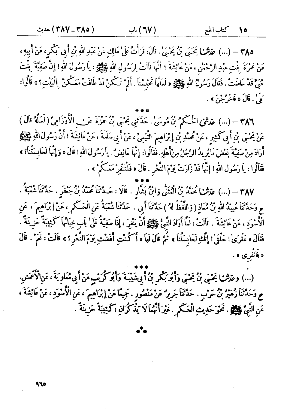 386 - (1211) حَدَّثَنِي الْحَكَمُ بْنُ مُوسَى، حَدَّثَنِي يَحْيَى بْنُ حَمْزَةَ، عَنِ الْأَوْزَاعِيِّ، لَعَلَّهُ قَالَ: عَنْ يَحْيَى بْنِ أَبِي كَثِيرٍ، عَنْ مُحَمَّدِ بْنِ إِبْرَاهِيمَ التَّيْمِيِّ، عَنْ أَبِي سَلَمَةَ، عَنْ عَائِشَةَ، أَنَّ رَسُولَ اللهِ صَلَّى اللهُ عَلَيْهِ وَسَلَّمَ أَرَادَ مِنْ صَفِيَّةَ بَعْضَ مَا يُرِيدُ الرَّجُلُ مِنْ أَهْلِهِ، فَقَالُوا: إِنَّهَا حَائِضٌ، يَا رَسُولَ اللهِ، قَالَ: «§وَإِنَّهَا لَحَابِسَتُنَا؟» فَقَالُوا: يَا رَسُولَ اللهِ، إِنَّهَا قَدْ زَارَتْ يَوْمَ النَّحْرِ، قَالَ: «فَلْتَنْفِرْ مَعَكُمْ»