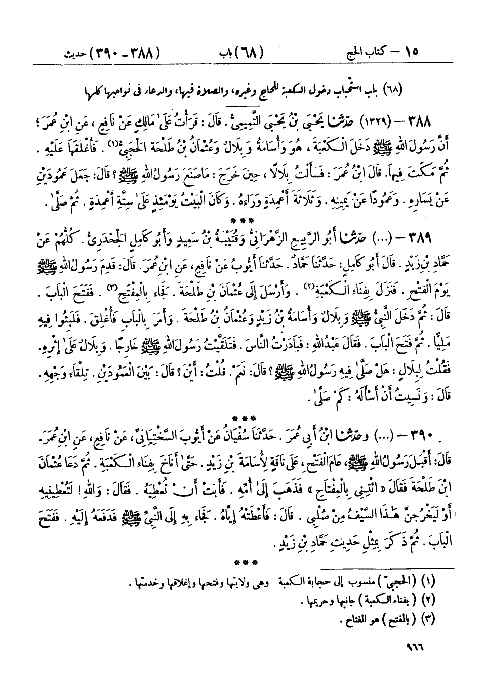 389 - (1329) حَدَّثَنَا أَبُو الرَّبِيعِ الزَّهْرَانِيُّ، وَقُتَيْبَةُ بْنُ سَعِيدٍ، وَأَبُو كَامِلٍ الْجَحْدَرِيُّ، كُلُّهُمْ عَنْ حَمَّادِ بْنِ زَيْدٍ، قَالَ أَبُو كَامِلٍ: حَدَّثَنَا حَمَّادٌ، حَدَّثَنَا أَيُّوبُ، عَنْ نَافِعٍ، عَنِ ابْنِ عُمَرَ، قَالَ: قَدِمَ رَسُولُ اللهِ صَلَّى اللهُ عَلَيْهِ وَسَلَّمَ يَوْمَ الْفَتْحِ، فَنَزَلَ بِفِنَاءِ الْكَعْبَةِ، وَأَرْسَلَ إِلَى عُثْمَانَ بْنِ طَلْحَةَ، فَجَاءَ بِالْمِفْتَحِ، فَفَتَحَ الْبَابَ، قَالَ: ثُمَّ دَخَلَ النَّبِيُّ صَلَّى اللهُ عَلَيْهِ وَسَلَّمَ وَبِلَالٌ، وَأُسَامَةُ بْنُ زَيْدٍ، وَعُثْمَانُ بْنُ طَلْحَةَ، وَأَمَرَ بِالْبَابِ فَأُغْلِقَ، فَلَبِثُوا فِيهِ مَلِيًّا، ثُمَّ فَتَحَ الْبَابَ، فَقَالَ عَبْدُ اللهِ: فَبَادَرْتُ النَّاسَ فَتَلَقَّيْتُ رَسُولَ اللهِ صَلَّى اللهُ عَلَيْهِ وَسَلَّمَ خَارِجًا وَبِلَالٌ عَلَى إِثْرِهِ، فَقُلْتُ لِبِلَالٍ: «§هَلْ صَلَّى فِيهِ رَسُولُ اللهِ صَلَّى اللهُ عَلَيْهِ وَسَلَّمَ؟» قَالَ: «نَعَمْ»، قُلْتُ: «أَيْنَ؟» قَالَ: «بَيْنَ الْعَمُودَيْنِ تِلْقَاءَ وَجْهِهِ»، قَالَ: " وَنَسِيتُ أَنْ أَسْأَلَهُ: كَمْ صَلَّى؟ ".