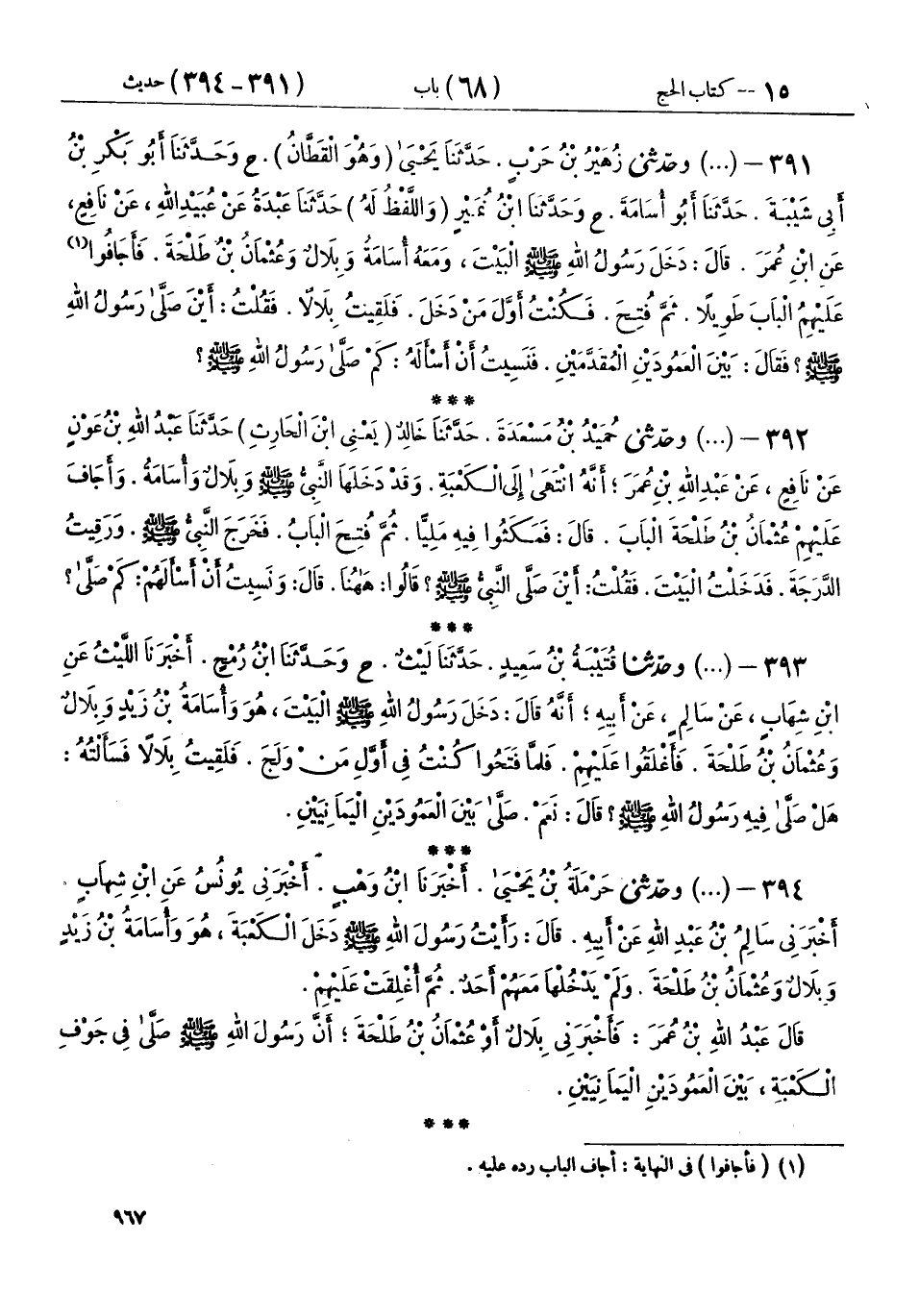 394 - (1329) وحَدَّثَنِي حَرْمَلَةُ بْنُ يَحْيَى، أَخْبَرَنَا ابْنُ وَهْبٍ، أَخْبَرَنِي يُونُسُ، عَنِ ابْنِ شِهَابٍ، أَخْبَرَنِي سَالِمُ بْنُ عَبْدِ اللهِ، عَنْ أَبِيهِ، قَالَ: «رَأَيْتُ رَسُولَ اللهِ صَلَّى اللهُ عَلَيْهِ وَسَلَّمَ §دَخَلَ الْكَعْبَةَ، هُوَ وَأُسَامَةُ بْنُ زَيْدٍ، وَبِلَالٌ، وَعُثْمَانُ بْنُ طَلْحَةَ، وَلَمْ يَدْخُلْهَا مَعَهُمْ أَحَدٌ، ثُمَّ أُغْلِقَتْ عَلَيْهِمْ»