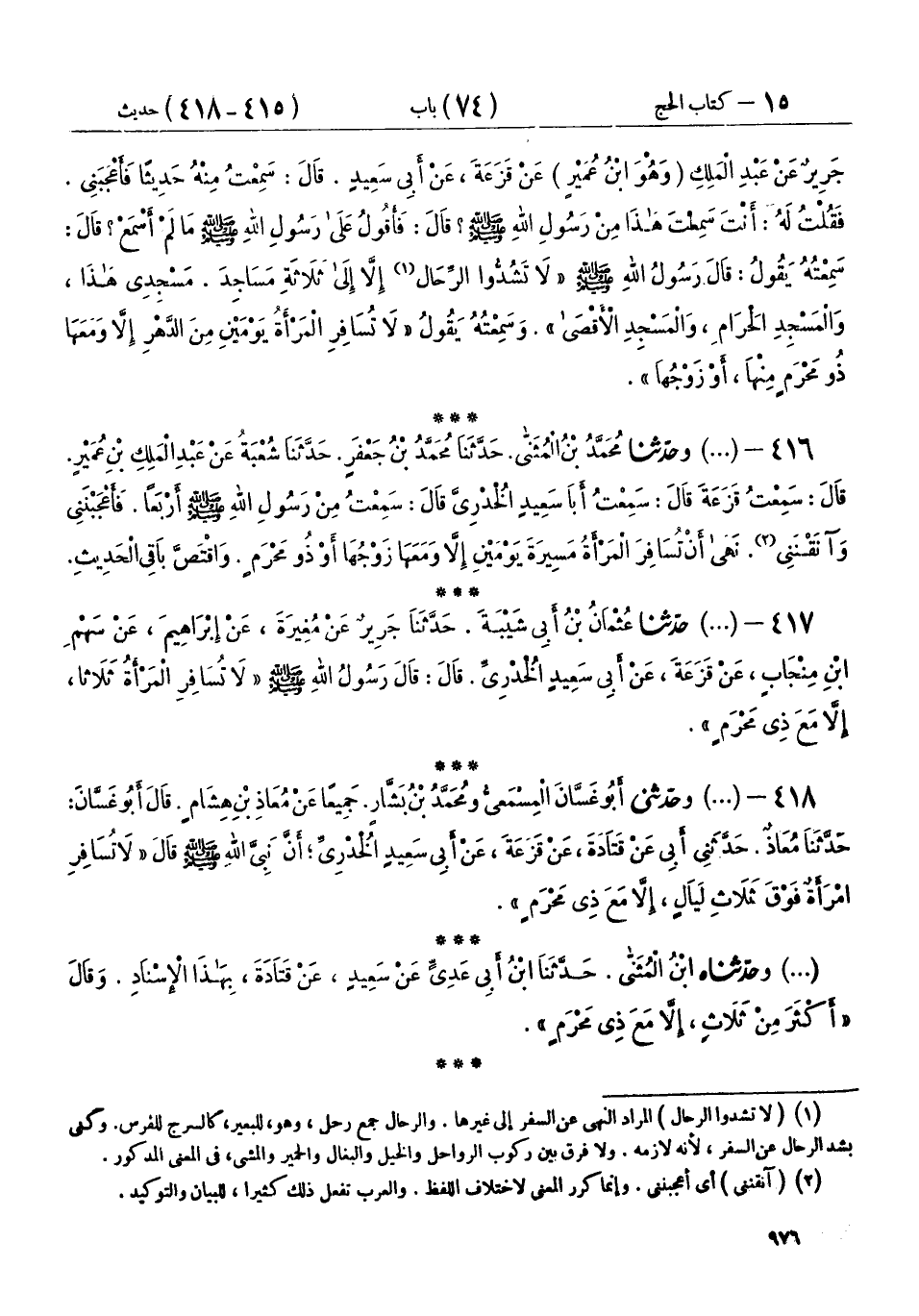 418 - (827) وحَدَّثَنِي أَبُو غَسَّانَ الْمِسْمَعِيُّ، وَمُحَمَّدُ بْنُ بَشَّارٍ جَمِيعًا عَنْ مُعَاذِ بْنِ هِشَامٍ، قَالَ أَبُو غَسَّانَ: حَدَّثَنَا مُعَاذٌ، حَدَّثَنِي أَبِي، عَنْ قَتَادَةَ، عَنْ قَزَعَةَ، عَنْ أَبِي سَعِيدٍ الْخُدْرِيِّ، أَنَّ نَبِيَّ اللهِ صَلَّى اللهُ عَلَيْهِ وَسَلَّمَ قَالَ: «§لَا تُسَافِرِ امْرَأَةٌ فَوْقَ ثَلَاثِ لَيَالٍ إِلَّا مَعَ ذِي مَحْرَمٍ»،