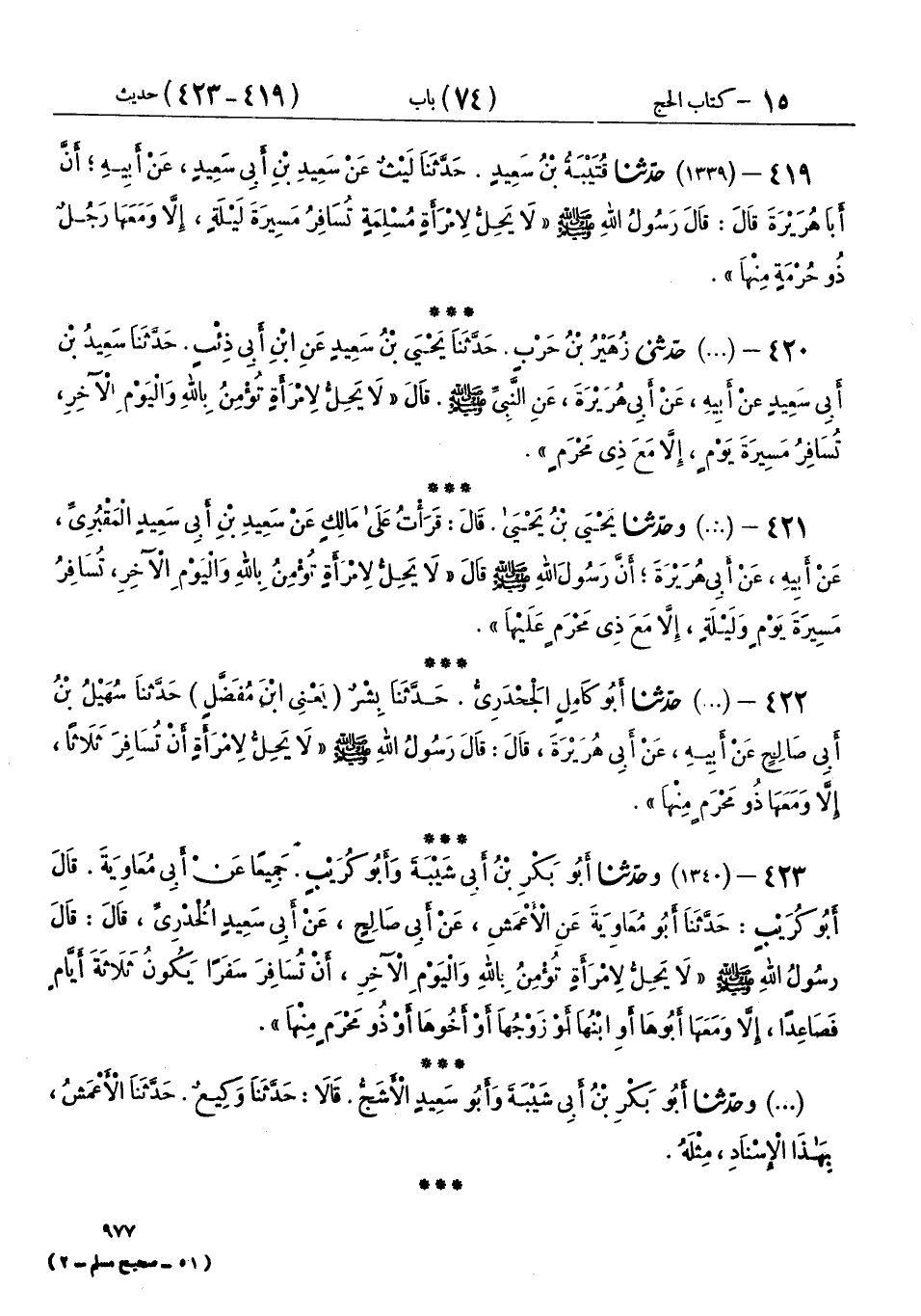 420 - (1339) حَدَّثَنِي زُهَيْرُ بْنُ حَرْبٍ، حَدَّثَنَا يَحْيَى بْنُ سَعِيدٍ، عَنِ ابْنِ أَبِي ذِئْبٍ، حَدَّثَنَا سَعِيدُ بْنُ أَبِي سَعِيدٍ، عَنْ أَبِيهِ، عَنْ أَبِي هُرَيْرَةَ، عَنِ النَّبِيِّ صَلَّى اللهُ عَلَيْهِ وَسَلَّمَ قَالَ: «§لَا يَحِلُّ لِامْرَأَةٍ تُؤْمِنُ بِاللهِ وَالْيَوْمِ الْآخِرِ، تُسَافِرُ مَسِيرَةَ يَوْمٍ إِلَّا مَعَ ذِي مَحْرَمٍ»