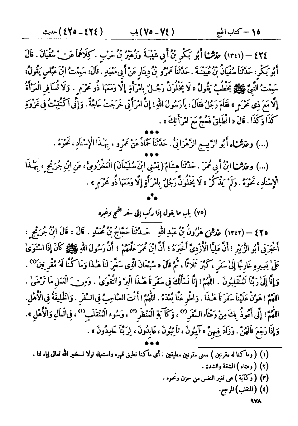 425 - (1342) حَدَّثَنِي هَارُونُ بْنُ عَبْدِ اللهِ، حَدَّثَنَا حَجَّاجُ بْنُ مُحَمَّدٍ، قَالَ: قَالَ ابْنُ جُرَيْجٍ: أَخْبَرَنِي أَبُو الزُّبَيْرِ، أَنَّ عَلِيًّا الْأَزْدِيَّ، أَخْبَرَهُ أَنَّ ابْنَ عُمَرَ عَلَّمَهُمْ؛ أَنَّ رَسُولَ اللهِ صَلَّى اللهُ عَلَيْهِ وَسَلَّمَ كَانَ إِذَا اسْتَوَى عَلَى بَعِيرِهِ خَارِجًا إِلَى سَفَرٍ، كَبَّرَ ثَلَاثًا، ثُمَّ قَالَ: «§سُبْحَانَ الَّذِي سَخَّرَ لَنَا هَذَا، وَمَا كُنَّا لَهُ مُقْرِنِينَ، وَإِنَّا إِلَى رَبِّنَا لَمُنْقَلِبُونَ، اللهُمَّ إِنَّا نَسْأَلُكَ فِي سَفَرِنَا هَذَا الْبِرَّ وَالتَّقْوَى، وَمِنَ الْعَمَلِ مَا تَرْضَى، اللهُمَّ هَوِّنْ عَلَيْنَا سَفَرَنَا هَذَا، وَاطْوِ عَنَّا بُعْدَهُ، اللهُمَّ أَنْتَ الصَّاحِبُ فِي السَّفَرِ، وَالْخَلِيفَةُ فِي الْأَهْلِ، اللهُمَّ إِنِّي أَعُوذُ بِكَ مِنْ وَعْثَاءِ السَّفَرِ، وَكَآبَةِ الْمَنْظَرِ، وَسُوءِ الْمُنْقَلَبِ فِي الْمَالِ وَالْأَهْلِ»، وَإِذَا رَجَعَ قَالَهُنَّ وَزَادَ فِيهِنَّ: «آيِبُونَ تَائِبُونَ عَابِدُونَ لِرَبِّنَا حَامِدُونَ»