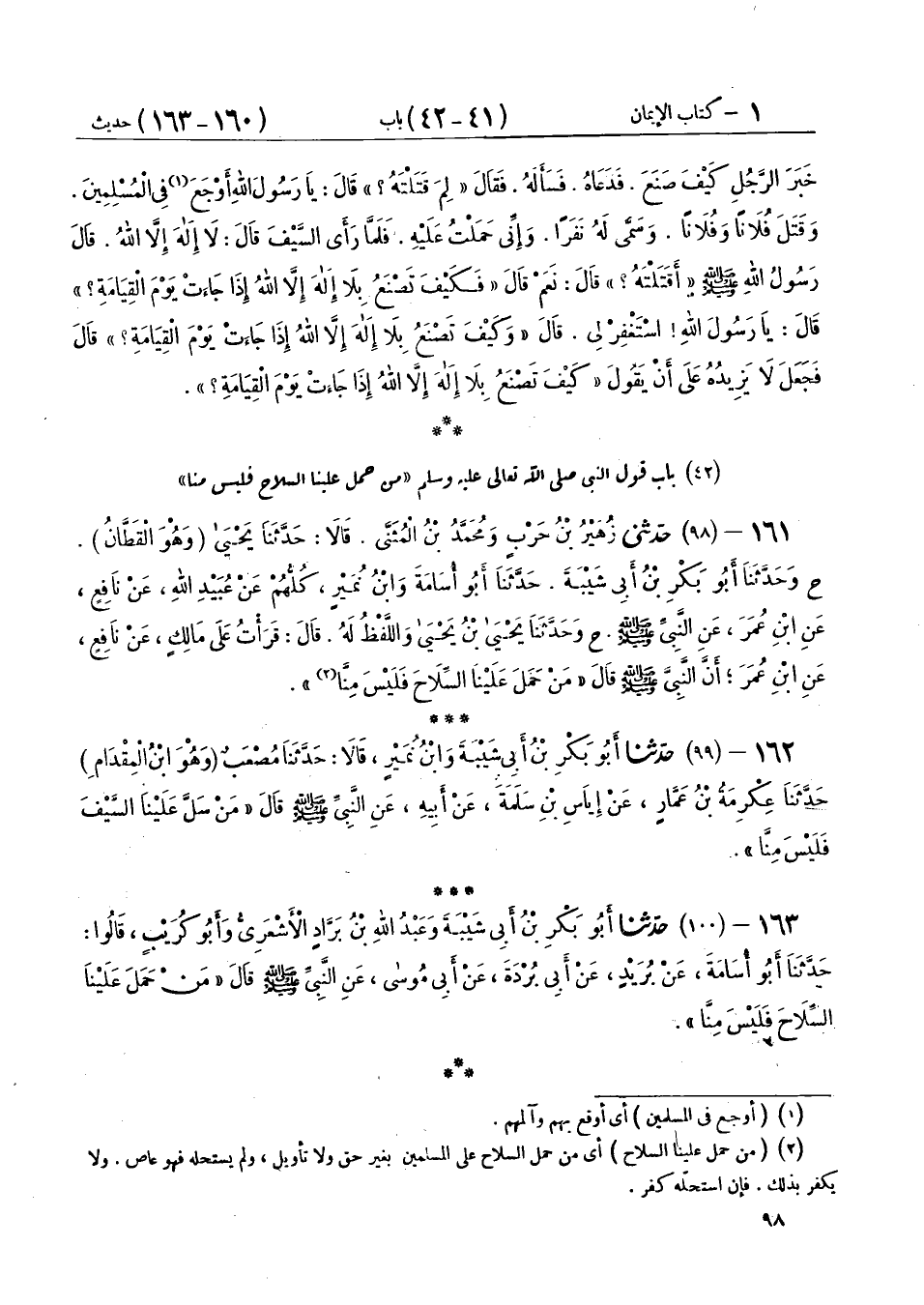 162 - (99) حَدَّثَنَا أَبُو بَكْرِ بْنُ أَبِي شَيْبَةَ، وَابْنُ نُمَيْرٍ، قَالَا: حَدَّثَنَا مُصْعَبٌ وَهُوَ ابْنُ الْمِقْدَامِ، حَدَّثَنَا عِكْرِمَةُ بْنُ عَمَّارٍ، عَنْ إِيَاسِ بْنِ سَلَمَةَ، عَنْ أَبِيهِ، عَنِ النَّبِيِّ صَلَّى اللهُ عَلَيْهِ وَسَلَّمَ قَالَ: «§مَنْ سَلَّ عَلَيْنَا السَّيْفَ فَلَيْسَ مِنَّا»