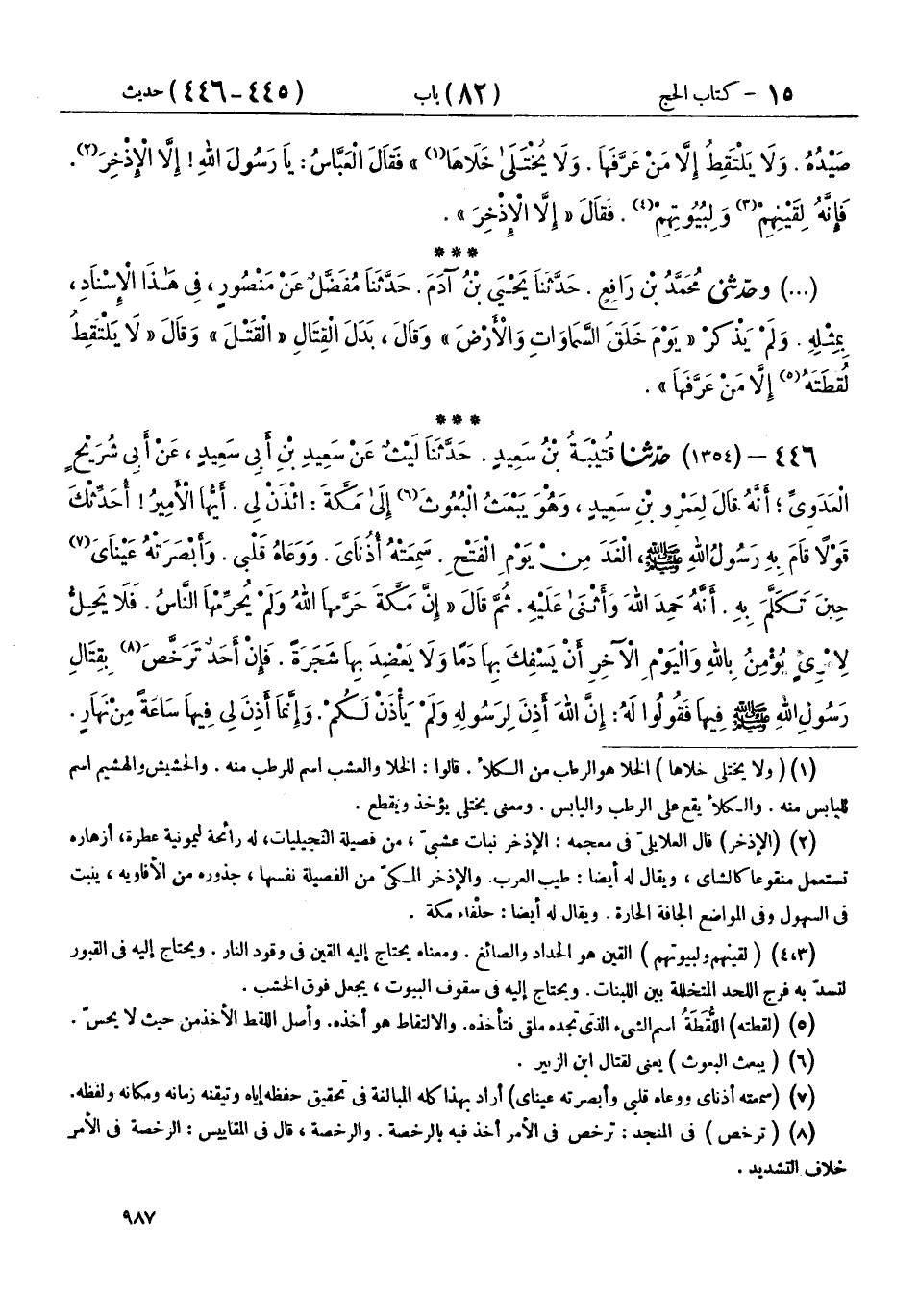 446 - (1354) حَدَّثَنَا قُتَيْبَةُ بْنُ سَعِيدٍ، حَدَّثَنَا لَيْثٌ، عَنْ سَعِيدِ بْنِ أَبِي سَعِيدٍ، عَنْ أَبِي شُرَيْحٍ الْعَدَوِيِّ، أَنَّهُ قَالَ لِعَمْرِو بْنِ سَعِيدٍ وَهُوَ يَبْعَثُ الْبُعُوثَ إِلَى مَكَّةَ: ائْذَنْ لِي أَيُّهَا الْأَمِيرُ أُحَدِّثْكَ قَوْلًا قَامَ بِهِ رَسُولُ اللهِ صَلَّى اللهُ عَلَيْهِ وَسَلَّمَ الْغَدَ مِنْ يَوْمِ الْفَتْحِ، سَمِعَتْهُ أُذُنَايَ، وَوَعَاهُ قَلْبِي، وَأَبْصَرَتْهُ عَيْنَايَ حِينَ تَكَلَّمَ بِهِ، أَنَّهُ حَمِدَ اللهَ، وَأَثْنَى عَلَيْهِ، ثُمَّ قَالَ: " إِنَّ §مَكَّةَ حَرَّمَهَا اللهُ وَلَمْ يُحَرِّمْهَا النَّاسُ، فَلَا يَحِلُّ لِامْرِئٍ يُؤْمِنُ بِاللهِ وَالْيَوْمِ الْآخِرِ أَنْ يَسْفِكَ بِهَا دَمًا، وَلَا يَعْضِدَ بِهَا شَجَرَةً، فَإِنْ أَحَدٌ تَرَخَّصَ بِقِتَالِ رَسُولِ اللهِ صَلَّى اللهُ عَلَيْهِ وَسَلَّمَ فِيهَا، فَقُولُوا لَهُ: إِنَّ اللهَ أَذِنَ لِرَسُولِهِ، وَلَمْ يَأْذَنْ لَكُمْ، وَإِنَّمَا أَذِنَ لِي فِيهَا سَاعَةً مِنْ نَهَارٍ، وَقَدْ عَادَتْ حُرْمَتُهَا الْيَوْمَ كَحُرْمَتِهَا بِالْأَمْسِ، وَلْيُبَلِّغِ الشَّاهِدُ الْغَائِبَ "، فَقِيلَ لِأَبِي شُرَيْح: مَا قَالَ لَكَ عَمْرٌو؟ قَالَ: أَنَا أَعْلَمُ بِذَلِكَ مِنْكَ يَا أَبَا شُرَيْح، «إِنَّ الْحَرَمَ لَا يُعِيذُ عَاصِيًا، وَلَا فَارًّا بِدَمٍ، وَلَا فَارًّا بِخَرْبَةٍ»