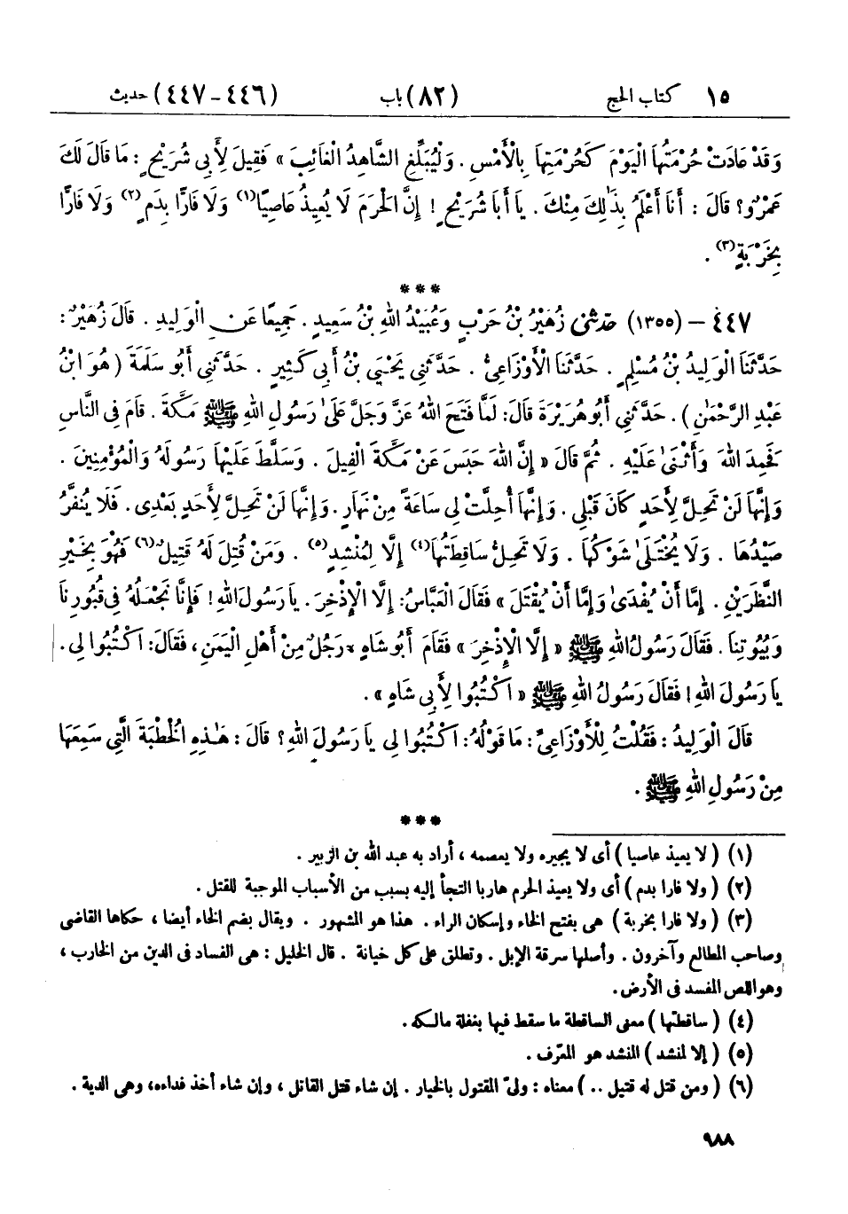 447 - (1355) حَدَّثَنِي زُهَيْرُ بْنُ حَرْبٍ، وَعُبَيْدُ اللهِ بْنُ سَعِيدٍ، جَمِيعًا عَنِ الْوَلِيدِ، قَالَ زُهَيْرٌ: حَدَّثَنَا الْوَلِيدُ بْنُ مُسْلِمٍ، حَدَّثَنَا الْأَوْزَاعِيُّ، حَدَّثَنِي يَحْيَى بْنُ أَبِي كَثِيرٍ، حَدَّثَنِي أَبُو سَلَمَةَ هُوَ ابْنُ عَبْدِ الرَّحْمَنِ، حَدَّثَنِي أَبُو هُرَيْرَةَ قَالَ: لَمَّا فَتَحَ اللهُ عَزَّ وَجَلَّ عَلَى رَسُولِ اللهِ صَلَّى اللهُ عَلَيْهِ وَسَلَّمَ مَكَّةَ، قَامَ فِي النَّاسِ، فَحَمِدَ اللهَ وَأَثْنَى عَلَيْهِ. ثُمَّ قَالَ: " إِنَّ §اللهَ حَبَسَ عَنْ مَكَّةَ الْفِيلَ، وَسَلَّطَ عَلَيْهَا رَسُولَهُ وَالْمُؤْمِنِينَ، وَإِنَّهَا لَنْ تَحِلَّ لِأَحَدٍ كَانَ قَبْلِي، وَإِنَّهَا أُحِلَّتْ لِي سَاعَةً مِنْ نَهَارٍ، وَإِنَّهَا لَنْ تَحِلَّ لِأَحَدٍ بَعْدِي، فَلَا يُنَفَّرُ صَيْدُهَا، وَلَا يُخْتَلَى شَوْكُهَا، وَلَا تَحِلُّ سَاقِطَتُهَا إِلَّا لِمُنْشِدٍ، وَمَنْ قُتِلَ لَهُ قَتِيلٌ فَهُوَ بِخَيْرِ النَّظَرَيْنِ: إِمَّا أَنْ يُفْدَى، وَإِمَّا أَنْ يُقْتَلَ "، فَقَالَ الْعَبَّاسُ: إِلَّا الْإِذْخِرَ يَا رَسُولَ اللهِ، فَإِنَّا نَجْعَلُهُ فِي قُبُورِنَا وَبُيُوتِنَا، فَقَالَ رَسُولُ اللهِ صَلَّى اللهُ عَلَيْهِ وَسَلَّمَ: «إِلَّا الْإِذْخِرَ» فَقَامَ أَبُو شَاهٍ - رَجُلٌ مِنْ أَهْلِ الْيَمَنِ - فَقَالَ: اكْتُبُوا لِي يَا رَسُولَ اللهِ، فَقَالَ رَسُولُ اللهِ صَلَّى اللهُ عَلَيْهِ وَسَلَّمَ: «اكْتُبُوا لِأَبِي شَاهٍ»، قَالَ الْوَلِيدُ: فَقُلْتُ لِلْأَوْزَاعِيِّ: مَا قَوْلُهُ: اكْتُبُوا لِي يَا رَسُولَ اللهِ؟ قَالَ: «هَذِهِ الْخُطْبَةَ الَّتِي سَمِعَهَا مِنْ رَسُولِ اللهِ صَلَّى اللهُ عَلَيْهِ وَسَلَّمَ»