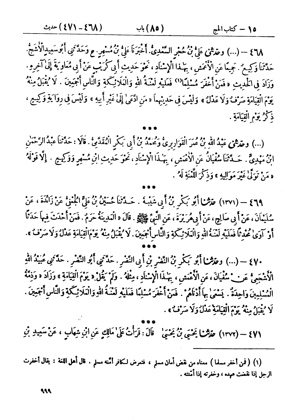 470 - (1371) وحَدَّثَنَا أَبُو بَكْرِ بْنُ النَّضْرِ بْنِ أَبِي النَّضْرِ، حَدَّثَنِي أَبُو النَّضْرِ، حَدَّثَنِي عُبَيْدُ اللهِ الْأَشْجَعِيُّ، عَنْ سُفْيَانَ، عَنِ الْأَعْمَشِ، بِهَذَا الْإِسْنَادِ مِثْلَهُ، وَلَمْ يَقُلْ: «يَوْمَ الْقِيَامَةِ» وَزَادَ: «وَذِمَّةُ الْمُسْلِمِينَ وَاحِدَةٌ يَسْعَى بِهَا أَدْنَاهُمْ، فَمَنْ أَخْفَرَ مُسْلِمًا، فَعَلَيْهِ لَعْنَةُ اللهِ وَالْمَلَائِكَةِ وَالنَّاسِ أَجْمَعِينَ، لَا يُقْبَلُ مِنْهُ يَوْمَ الْقِيَامَةِ عَدْلٌ، وَلَا صَرْفٌ»