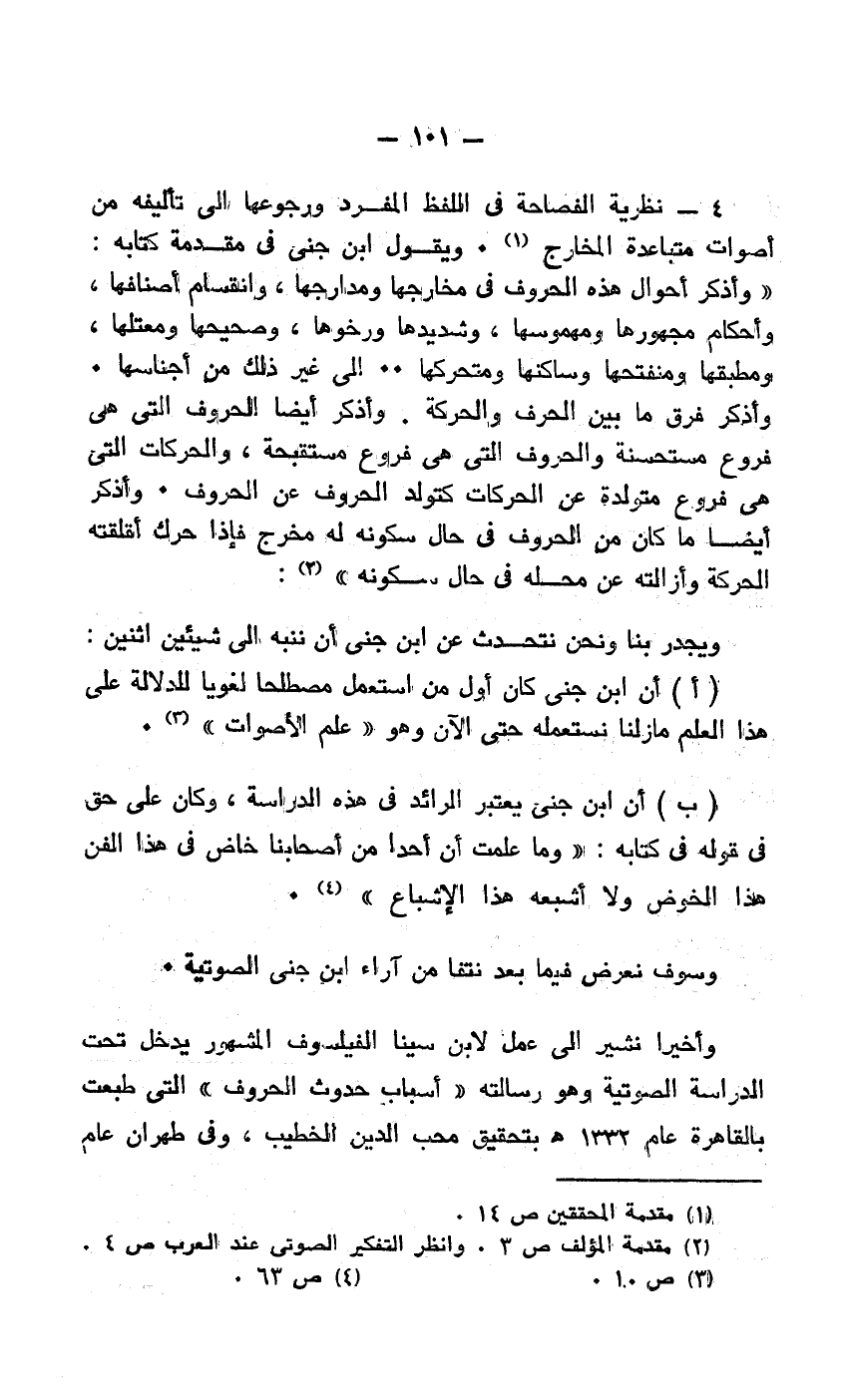 4- نظرية الفصاحة في اللفظ المفرد ورجوعها إلى تأليفه من أصوات متباعدة المخارج1. ويقول ابن جني في مقدمة كتابه.