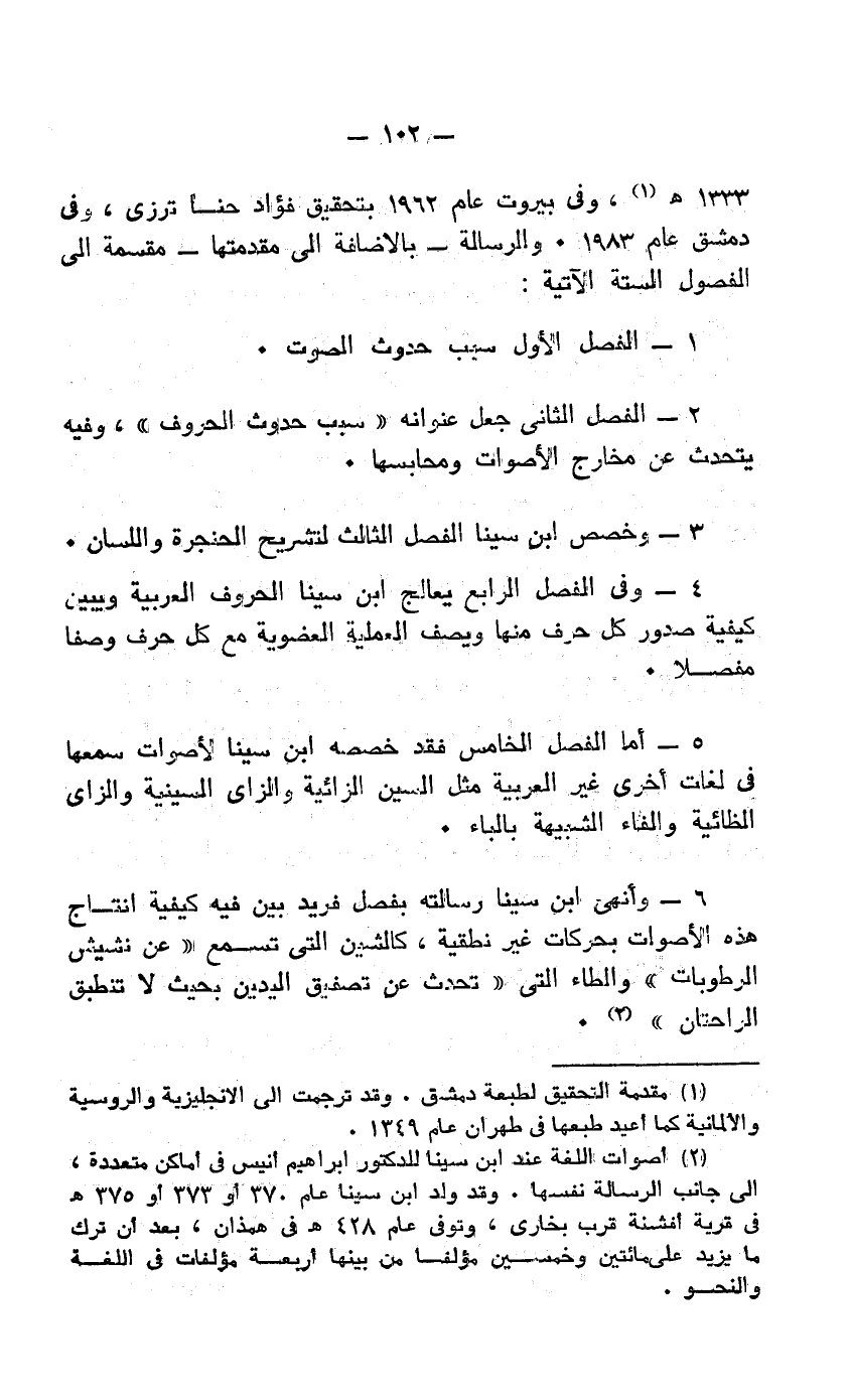 2 أصوات اللغة عند ابن سينا للدكتور إبراهيم أنيس في أماكن متعددة، إلى جانب الرسالة نفسها. وقد ولد ابن سينا عام 370 أو 373 أو 375 هـ في قرية أفشنة قرب بخارى، وتوفي عام 428 هـ في همذان، بعد أن ترك ما يزيد على مائتين وخمسين مؤلفًا من بينها أربعة مؤلفات في اللغة والنحو.