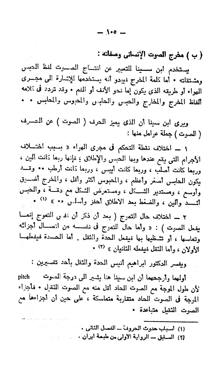 أولهما وأرجحهما: أن ابن سينا هنا يشير إلى درجة الصوت pitch لأن طول الموجة مع الصوت الحاد أقل منه مع الصوت الثقيل. فأجزاء الموجه في الصوت الحاد متقاربة متمساكة، على حين أن أجزاءها مع الصوت الثقيل متباعدة.