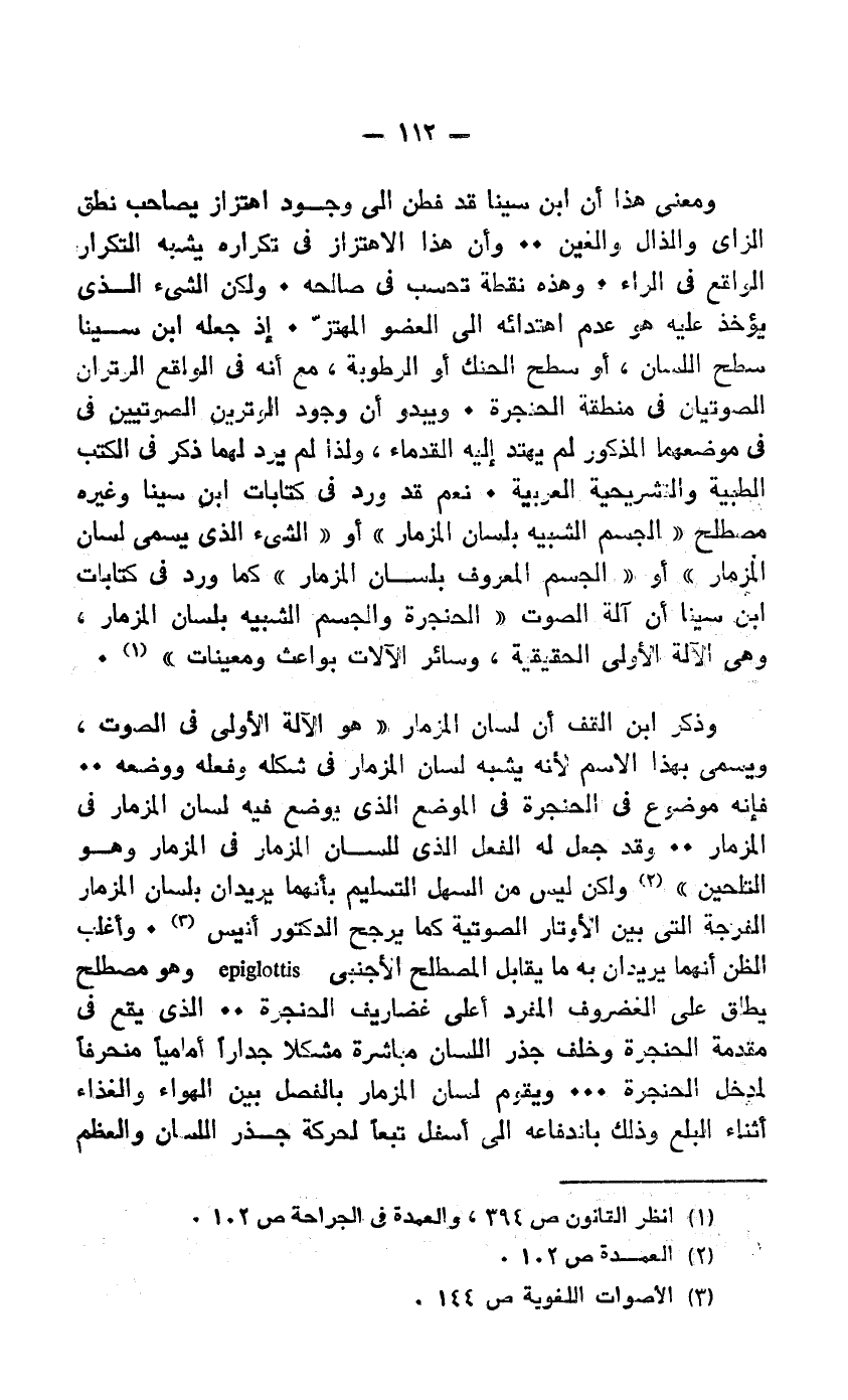 وذكر ابن القف أن لسان المزمار "هو الآلة الأولى في الصوت، ويسمى بهذا الاسم لأنه يشبه لسان المزمار في شكله وفعله ووضعه.. فإنه موضوع في الحنجرة في الموضع الذي يوضع فيه لسان المزمار في المزمار.. وقد جعل له الفعل الذي للسان المزمار في المزمار وهو التلحين"2 ولكن ليس من السهل التسليم بأنهما يريدان بلسان المزمار الفرجة التي بين الأوتار الصوتية كما يرجح الدكتور أنيس3.