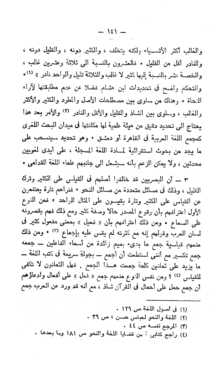 والتحكم واضح في تحديدات ابن هشام فضلًا عن عدم مطابقتها لآراء النحاة. وهناك من ساوى بين مصطلحات الأصل والمطرد والكثير والأكثر والغالب، وساوى بين الشاذ والقليل والأقل والنادر2 والأمر بعد هذا يحتاج إلى تحديد دقيق من هيئة علمية لها مكانتها في ميدان البحث اللغوي كمجمع اللغة العربية في القاهرة أو دمشق. وهو تحديد سينسحب على ما يجد من بحوث استقرائية لمادة اللغة أو دمشق.