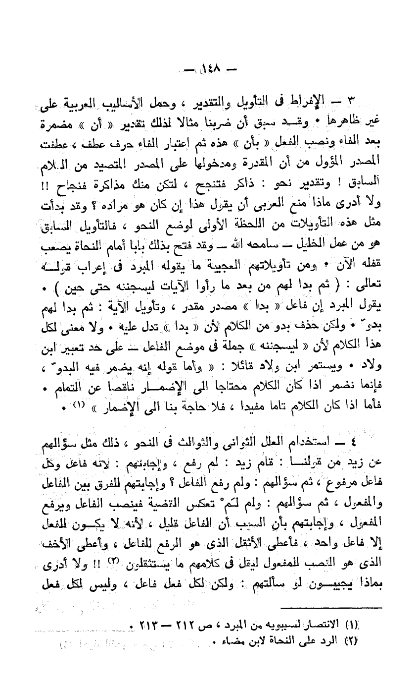 وقد بدأت مثل هذه التأويلات من اللحظة الأولى لوضع النحو، فالتأويل السابق هو من عمل الخليل -سامحه الله- وقد نتج بذلك بابًا أمام النحاة يصعب قفله الآن. ومن تأويلاتهم العجيبة ما يقوله المبرد في إعراب قوله تعالى: {ثُمَّ بَدَا لَهُمْ مِنْ بَعْدِ مَا رَأَوُا الْآيَاتِ لَيَسْجُنُنَّهُ حَتَّى حِينٍ} . يقول المبرد إن فاعل "بدا" مصدر مقدر، وتأويل الآية: ثم بدا لهم بدو. ولكن حذف بدو من الكلام لأن "بدا" تدل عليه. ولا معنى لكل هذا الكلام لأن "ليسجننه" جملة في موضع الفاعل - على حد تعبير ابن ولاد. ويستمر ابن ولاد قائلًا: "وأما قوله: إنه يضمر فيه البدو، فإنما نضمر إذا كان الكلام محتاجًا إلى الإضمار ناقصًا عن التمام.