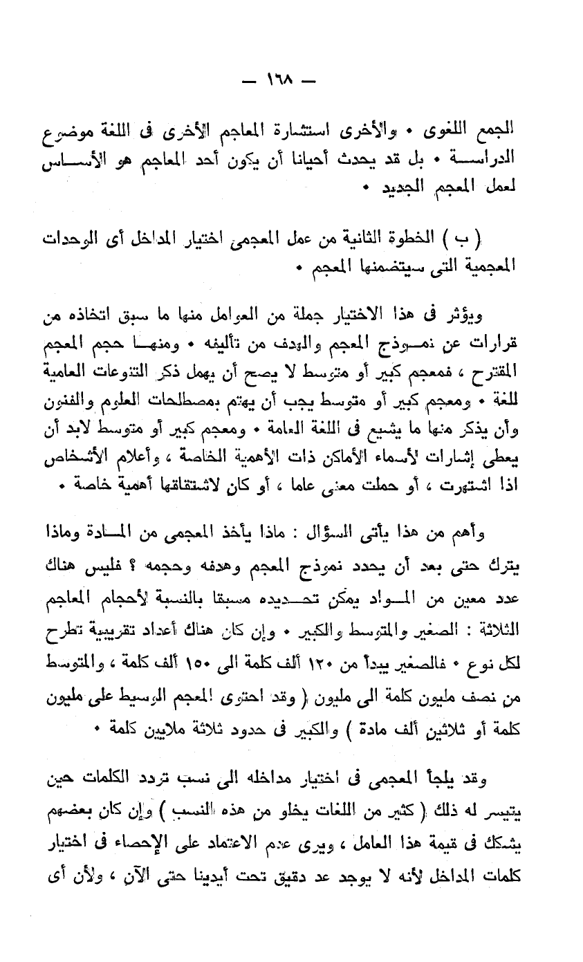 وأهم من هذا يأتي السؤال: ماذا يأخذ المعجمي من المادة وماذا يترك حتى بعد أن يحدد نموذج المعجم وهدفه وحجمه؟ فليس هناك عدد معين من المواد يمكن تحديده مسبقًا بالنسبة لأحجاج المعاجم الثلاثة: الصغير والمتوسط والكبير. وإن كان هناك أعداد تقريبية تطرح لكل نوع. فالصغير يبدأ من 120 ألف كلمة إلى 150 ألف كلمة، والمتوسط من نصف مليون كلمة إلى مليون "وقد احتوى المعجم الوسيط على مليون كلمة أو ثلاثين ألف مادة" والكبير في حدود ثلاثة ملايين كلمة.