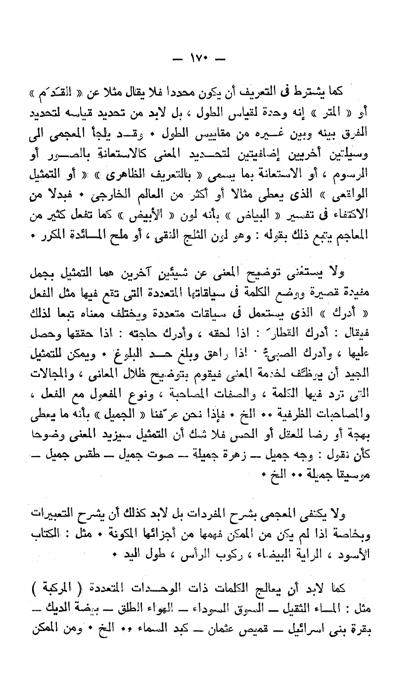 ولا يكتفي المعجمي بشرح المفردات بل لا بد كذلك أن يشرح التعبيرات وبخاصة إذا لم يكن من الممكن فهمها من أجزائها المكونة. مثل: الكتاب الأسود، الراية البيضاء، ركوب الرأس، طول اليد.