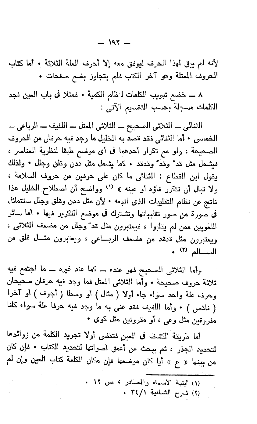 الثنائي - الثلاثي الصحيح - الثلاثي المعتل - اللفيف - الرباعي - الخماسي - أما الثنائي فقد قصد به الخليل ما وجد فيه حرفان من الحروف الصحيحة، ولو مع تكرار أحدهما في أي موضع طبقًا لنظرية العناصر، فيشمل مثل قد وقد وقدقد. كما يشمل مثل ددن وقلق وجلل. ولذلك يقول ابن القطاع: الثنائي ما كان على حرفين من حروف السلامة، ولا تبال أن تتكرر فاؤه أو عينه"1 وواضح أن اصطلاح الخليل هذا ناتج عن نظام التقليبات الذي اتبعه، لأن مثل ددن وقلق وجلل ستتماثل في صورة من صور تقليباتها وتشترك في موضع التكرير فيها. أما سائر اللغويين ممن لم يقلبوا، فيعتبرون مثل قد وجلل من مضعف الثلاثي، ويعتبرون مثل قدقد من مضعف الرباعي، ويعتبرون مثل قلق من السالم2.