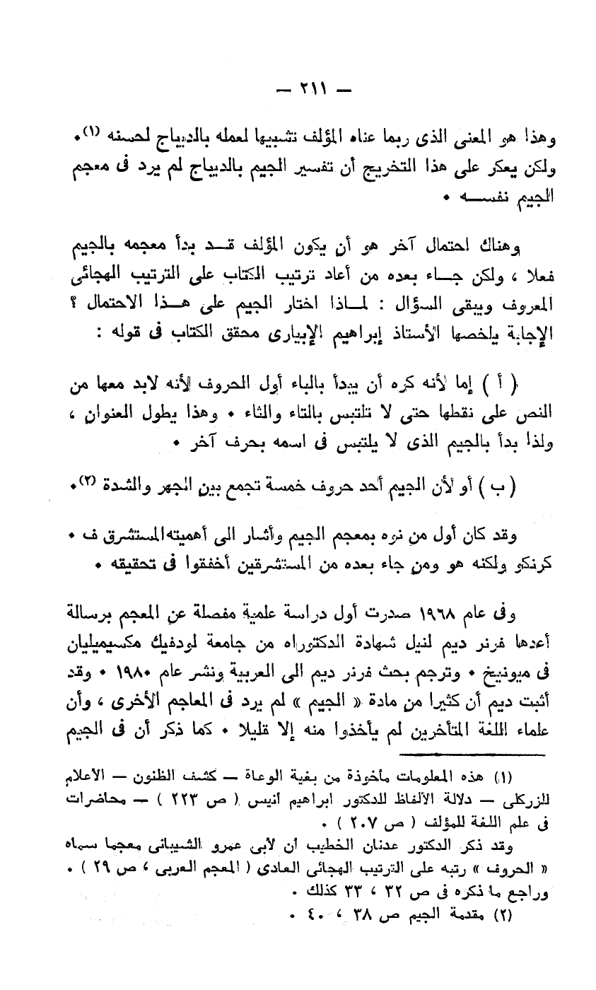 وفي عام 1968 صدرت أول دراسة علمية مفصلة عن المعجم برسالة أعدها فرنر ديم لنيل شهادة الدكتوراه من جامعة لودفيك مكسيميليان في ميونيخ. وترجم بحث فرنر ديم إلى العربية ونشر عام 1980. وقد أثبت ديم أن كثيرًا من مادة "الجيم" لم يرد في المعاجم الأخرى، وأن علماء اللغة المتأخرين لم يأخذوا منه إلا قليلًا. كما ذكر أن في الجيم