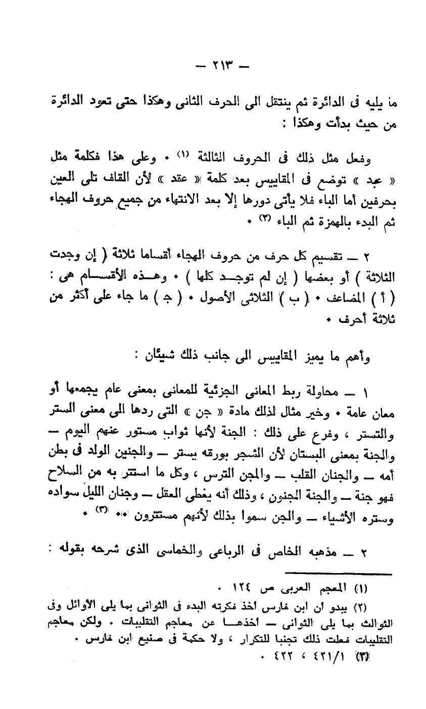 2 يبدو أن ابن فارس أخذ فكرته البدء في الثواني بما يلي الأوائل وفي الثوالث بما يلي الثواني - أخذها عن معاجم التقليبات. ولكن معاجم التقليبات فعلت ذلك تجنبًا للتكرار، ولا حكمة في صنيع ابن فارس.