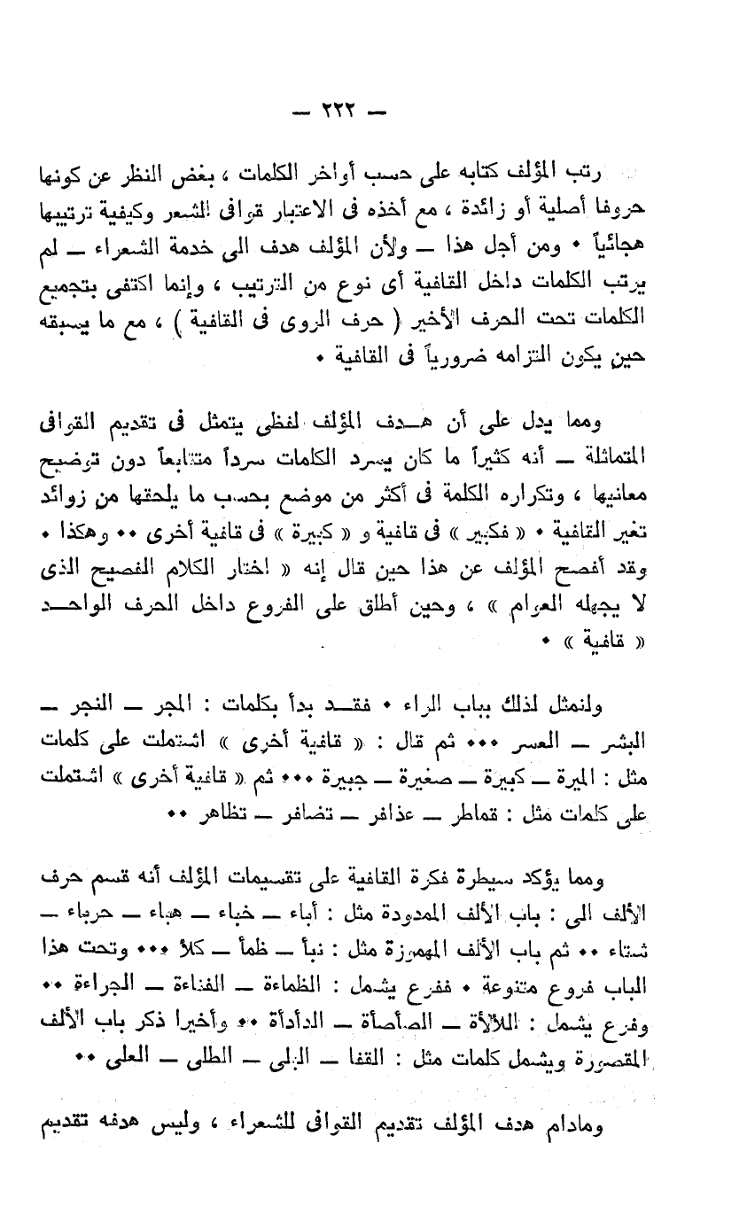 ومما يؤكد سيطرة فكرة القافية على تقسيمات المؤلف أنه قسم حرف الألف إلى: باب الألف الممدودة مثل: أباء - خباء - هباء - حرباء - شتاء ... ثم باب الألف المهموزة مثل: نبأ - ظمأ - كلأ - ... وتحت هذا الباب فروع متنوعة. ففرع يشمل: الظماء - الفناءة - الجراءة ... وفرع يشمل: اللألأة - الصأصأة - الدأدأة ... وأخيرًا ذكر باب الألف المقصورة ويشمل كلمات مثل: القفا - البلى - الطلى - العلى....