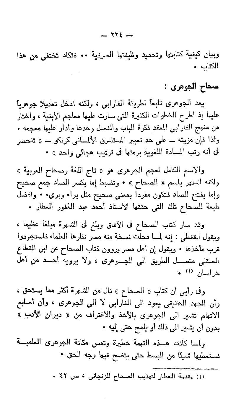 وفي رأيي أن كتاب "الصحاح" نال من الشهرة أكثر مما يستحق، وأن الجهد الحقيقي يعود إلى الفارابي لا إلى الجوهري، وأن أصابع الاتهام تشير إلى الجوهري بالأخذ والاغتراف من "ديوان الأدب" بدون أن يشير إلى ذلك أو يلمح حتى إليه.
