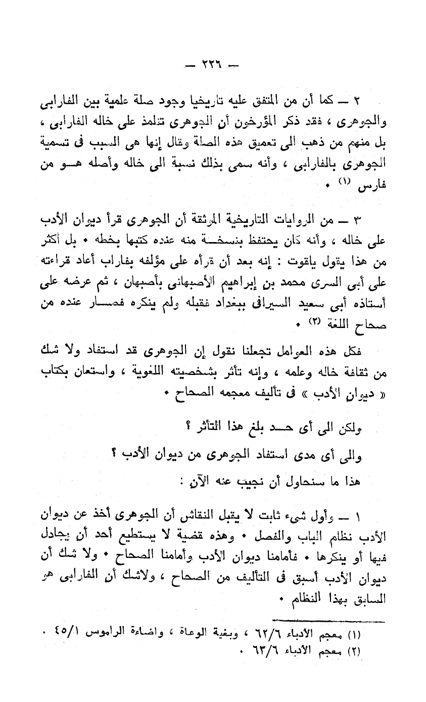 1- وأول شيء ثابت لا يقبل النقاش أن الجوهري أخذ عن "ديوان الأدب" نظام الباب والفصل. وهذه قضية لا يستطيع أحد أن يجادل فيها أو ينكرها. فأمامنا ديوان الأدب وأمامنا الصحاح. ولا شك أن ديوان الأدب أسبق في التأليف من الصحاح، ولا شك أن الفارابي هو السابق بهذا النظام.