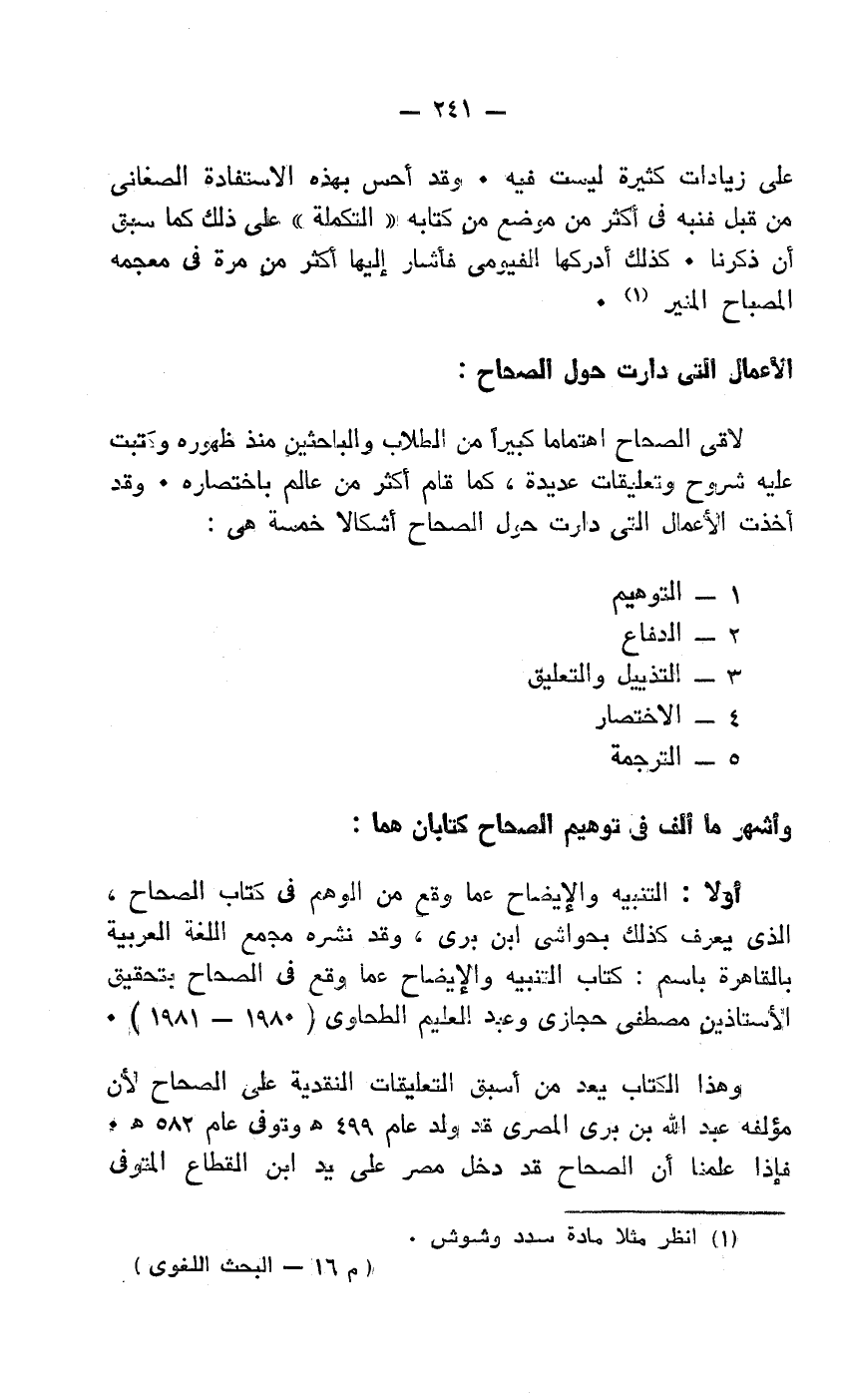 أولًا: التنبيه والإيضاح عما وقع من الوهم في كتاب الصحاح، الذي يعرف كذلك بحواشي ابن بري. وقد نشره مجمع اللغة العربية بالقاهرة باسم: "كتاب التنبيه والإيضاح عما وقع في الصحاح" بتحقيق الأستاذين مصطفى حجازي وعبد العليم الطحاوي "1980 - 1981".