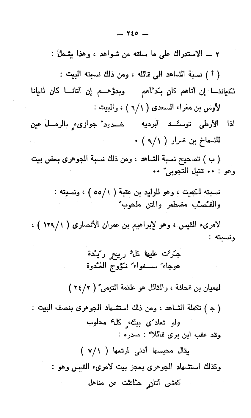 ب- تصحيح نسبة الشاهد، ومن ذلك نسبة الجوهري بعض بيت وهو ... قتيل التجوبي..