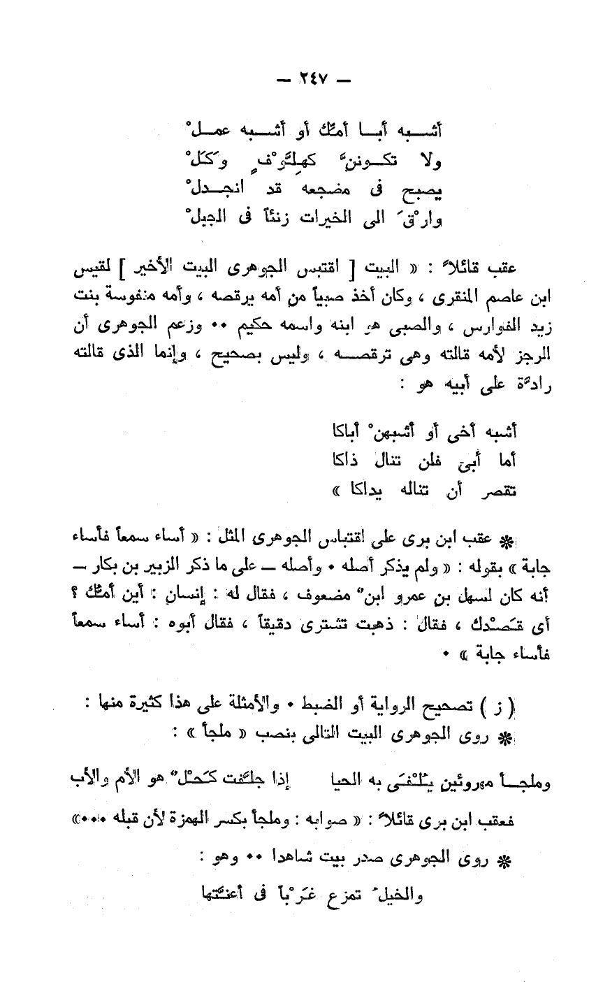 * عقب ابن بري على اقتباس الجوهري المثل: "أساء سمعًا فأساء جابة" بقوله: "ولم يذكر أصله. وأصله -على ما ذكر الزبير بن بكار- إنه كان لسهل بن عمرو بن مضعوف، فقال له: إنسان: أين أمك؟ أي قصدك، فقال: ذهبت تشتري دقيقًا فقال أبوه: أساء سمعًا فأساء جابة".