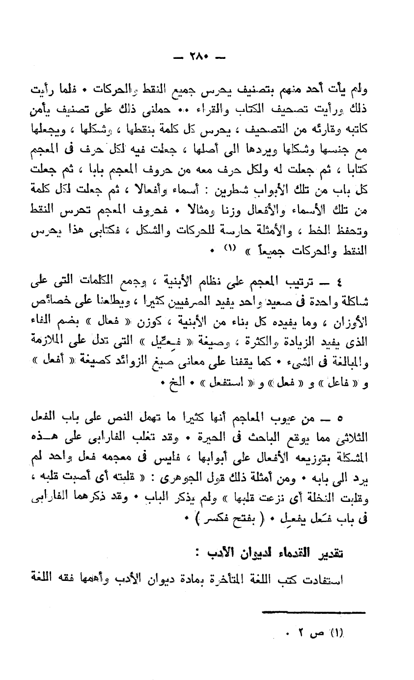 5- من عيوب المعاجم أنها كثيرًا ما تهمل النص على باب الفعل الثلاثي مما يوقع الباحث في الحيرة. وقد تغلب الفارابي على هذه المشكلة بتوزيعه الأفعال على أبوابها، فليس في معجمه فعل واحد لم يرد إلى بابه. ومن أمثلة ذلك قول الجوهري: "قلبته أي: أصبت قلبه، وقلبت النخلة أي نزعت قلبها" ولم يذكر الباب. وقد ذكرهما الفارابي في باب فعل يفعل. "بفتح فكسر".