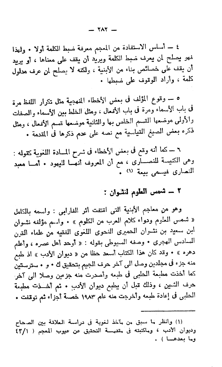 4- أساس الاستفادة من المعجم معرفة ضبط الكلمة أولًا. ولهذا فهو يصلح لمن يعرف ضبط الكلمة ويريد أن يقف على معناها، أو يريد أن يقف على خصائص بناء من الأبنية، ولكنه لا يصلح لمن عرف مدلول كلمة، وأراد الوقوف على ضبطها.