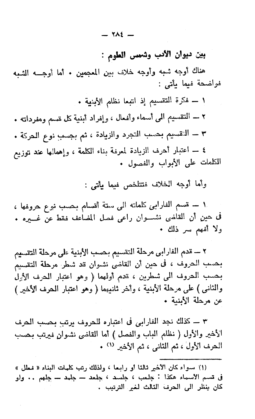 1- قسم الفارابي كلماته إلى ستة أقسام بحسب نوع حروفها، في حين أن القاضي نشوان راعى فصل المضاعف فقط عن غيره. ولا أفهم سر ذلك.